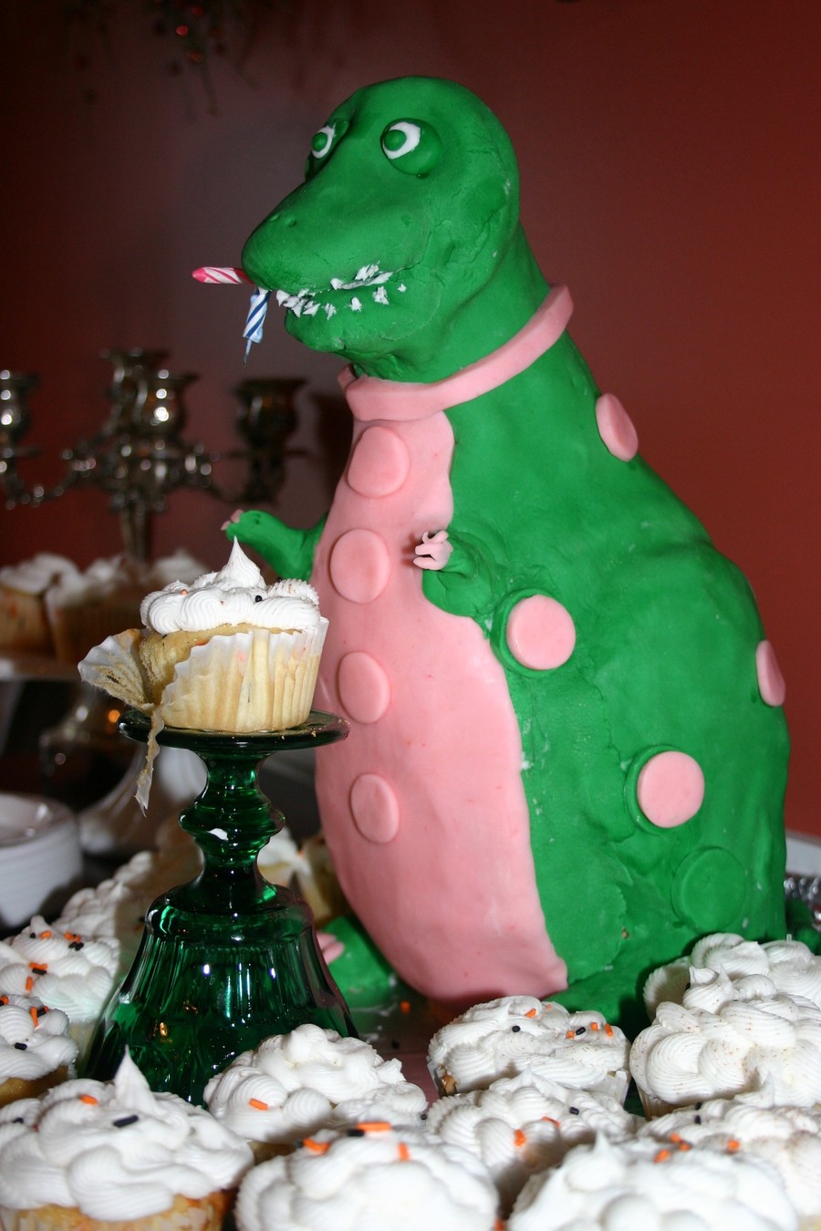 My daughter loves dinosaurs-they even fill her doll house. She designed this, and I got carving....she loved it. Tried to make it attacking the candles and a cupcake...made of rice crispies on top, cake bottom-easier to manipulate...