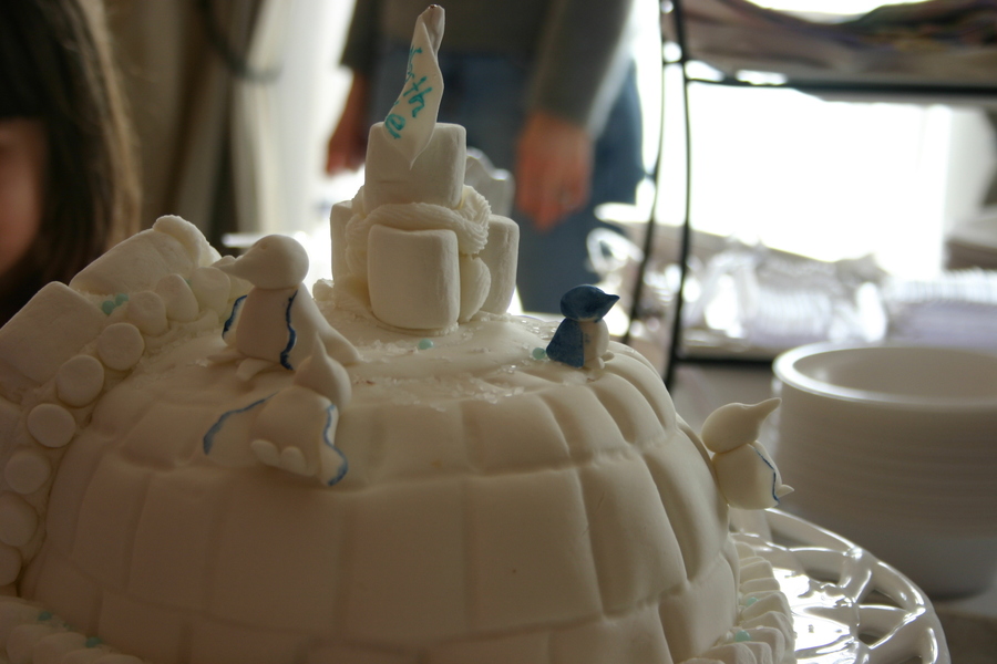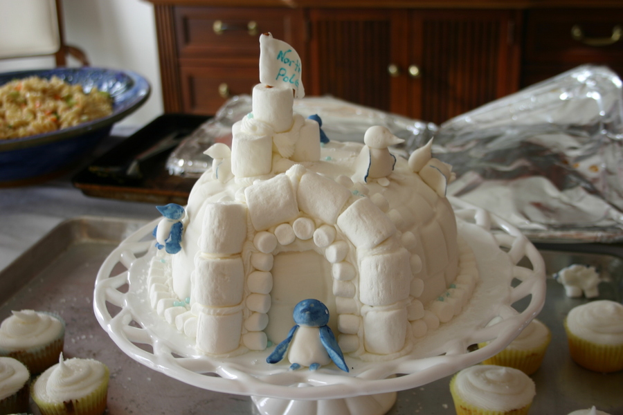 my daughter wanted an igloo with fondant polar bears....I convinced her that my skills were better suited for penguins....she agreed, thankfully. Covered in fondant and marshmellows....gumpaste penguins.