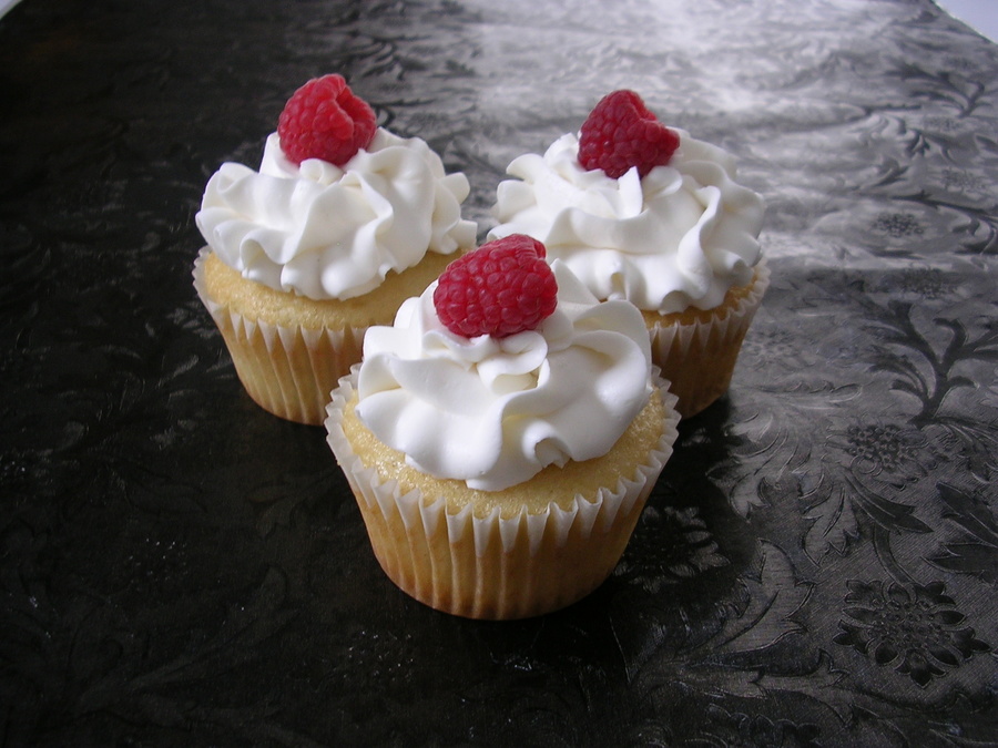 Vanilla Cupcakes with Raspberry Cream filling, iced with Vanilla Bettercreme and topped with a fresh raspberry.