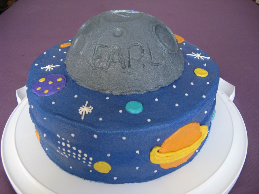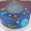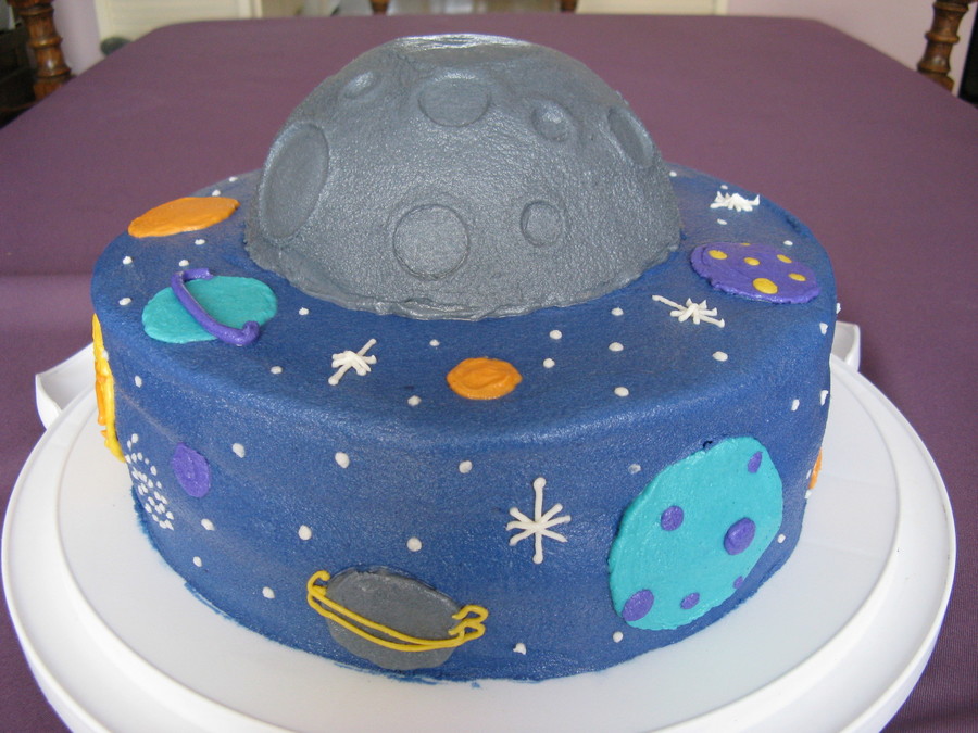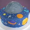 10" round with half a ball pan for the moon. Stars and planets are piped on.