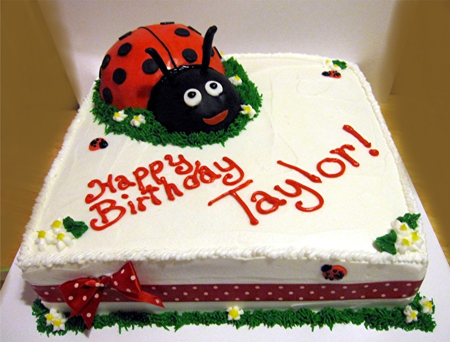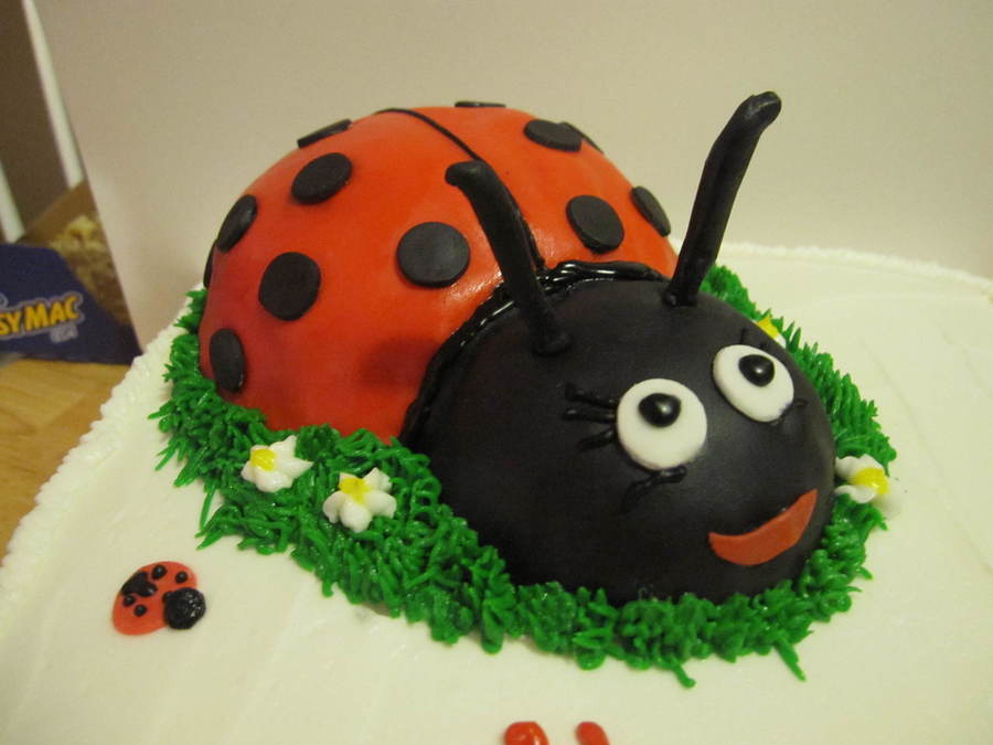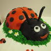 This lady bug cake is a 10" square vanilla cake with buttercream icing. The tiny ladybugs are MMF, and the big ladybug is vanilla cake covered in MMF. Ribbon is real.... I don't think MMF makes good ribbon - especially polka dot!
