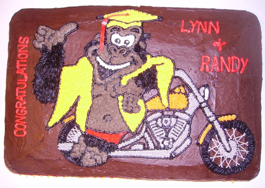 My best friend and her husband were both Graduating at the same time - she from Pittsburg State (Gorillas) and he from a Harley Motorcycle Repair School. So I had to think of a way to combine the two... wasn't easy, but this is what I came with. ;)
