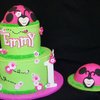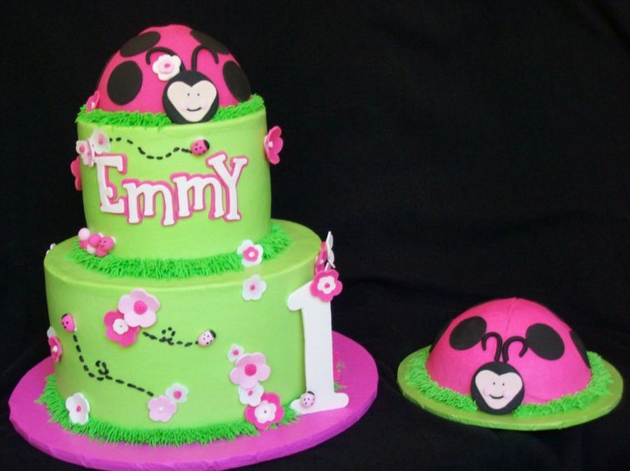 All buttercream with fondant accents. Ladybugs are made of 1/2 ball cake pans. Samsh cake was iced in buttercream to make the smashing that much more fun! The buttercream icing gave me fits this day. No matter what I couldn't get that top bulge to go away!! But it was still a really fun cake to make.