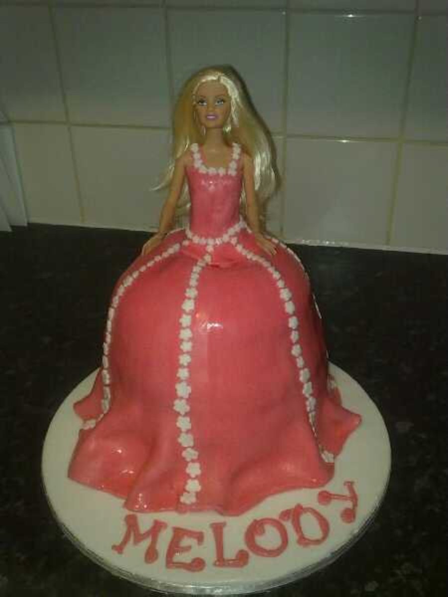 barbie dress cake with reusuable barbie doll - maderia with buttercream and fondant icing