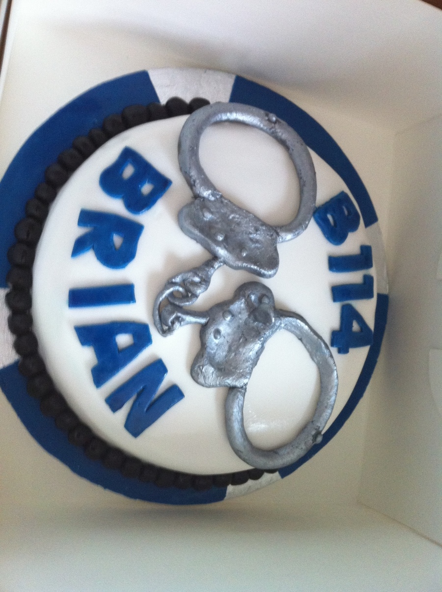 a police officer's birthday cake - old fashioned handcuffs (for his age!) and his badge details