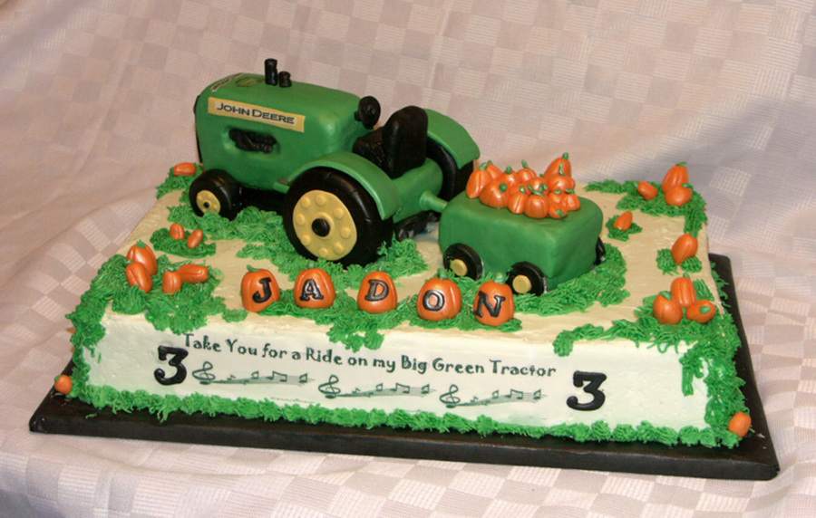 Birthday cake for a 3 year who loves John Deere tractors and the song "Take You for a Ride on My Big Green Tractor". Chocolate cake with chocolate ganache filling, iced in buttercream. Tractor and trailer are carved rice krispie treats covered in fondant. Pumpkins are fondant. Everything is edible.