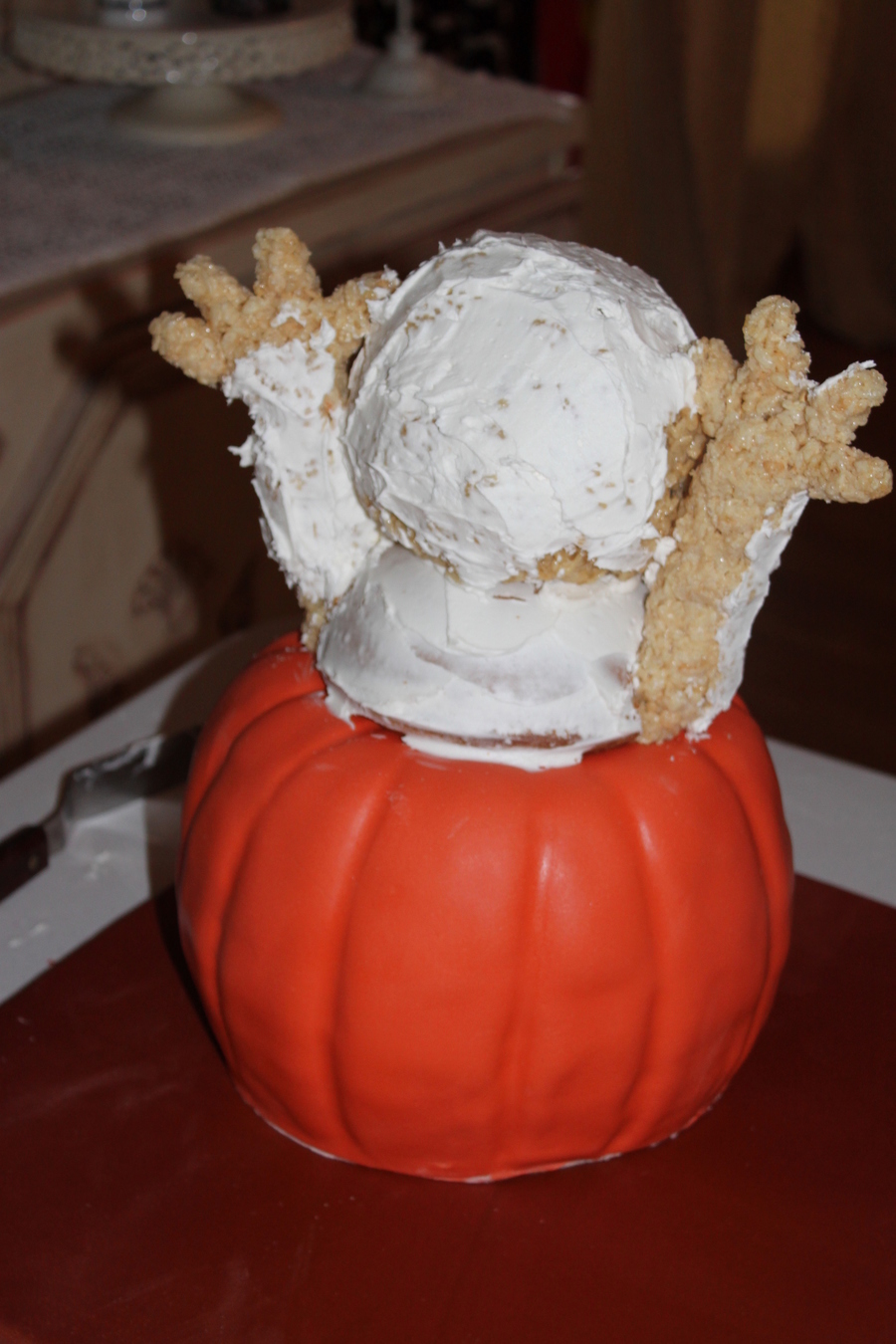 Pumpkin made of pumpkin spice cake filled with cream cheese, pumpkin top made of cinnamon roll cake both covered in buttercream and fondant. Elmo's head is made of rice crispy treats and the body is cinnamon roll cake and covered in buttercream. Leaves are made of fondant and hand painted. Eyes and nose, rice crispy treats covered in buttercream and fondant.