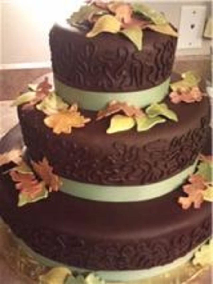 Chocolate fondant with chocolate b/c cornelli lace. Chocolate cake with mint filling. Leaves are gumpaste.