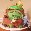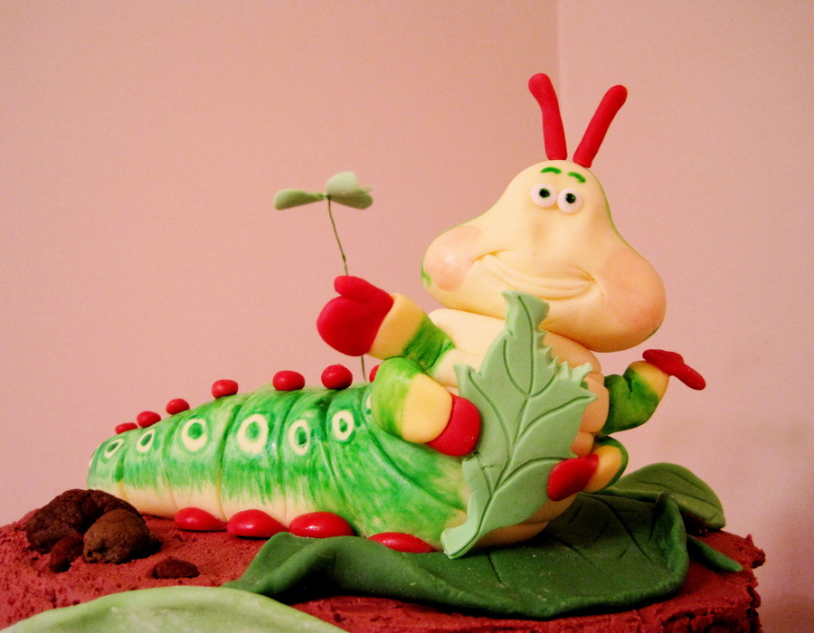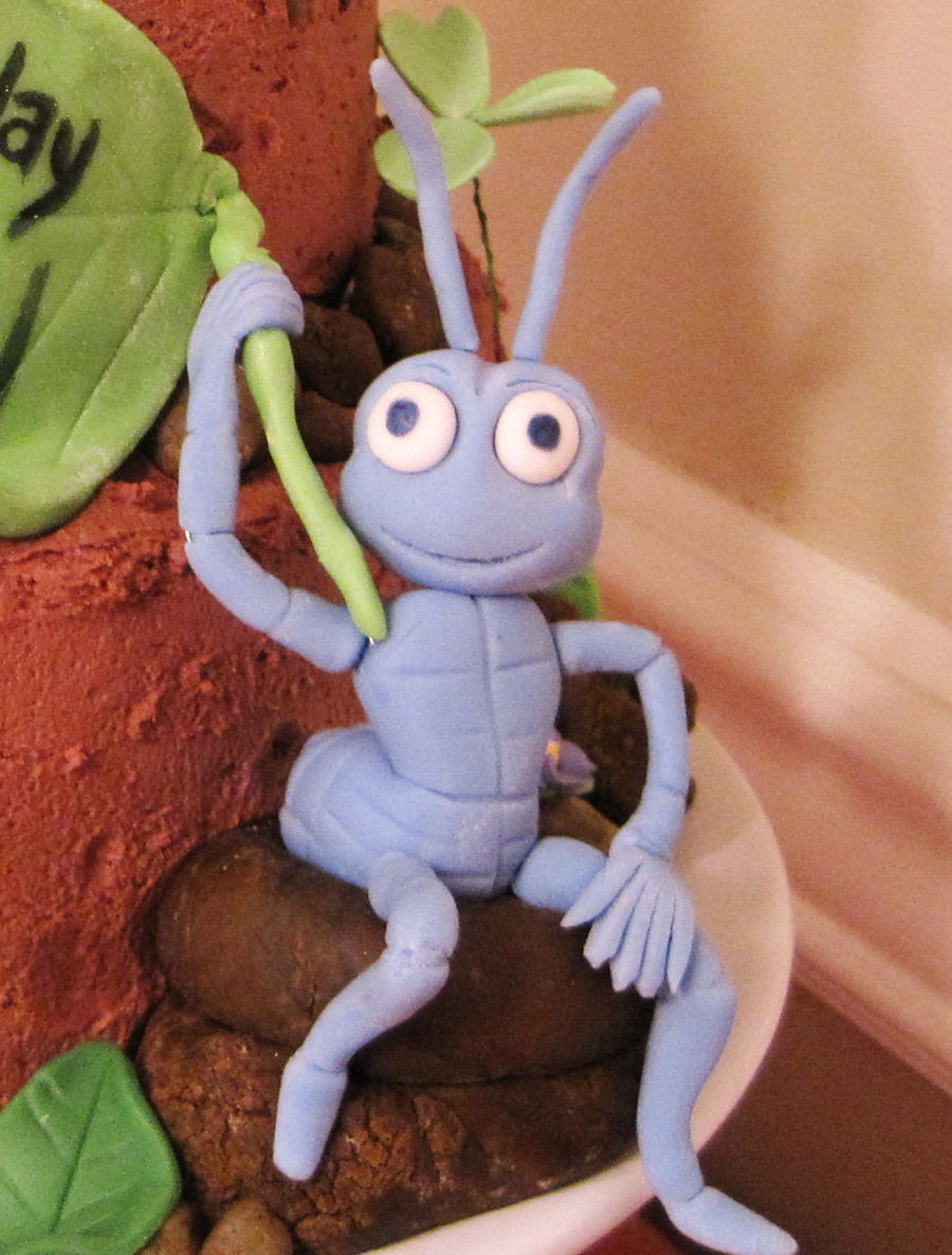 This double chocolate cake is filled with butter cream frosting and covered in chocolate frosting. I iced it carelessly for an outdoor feel. Heimlich the caterpillar has a rice crispy treat base and is covered with Wilton rolled fondant, I then hand painted him with edible paint. He was a labor of love, but I am happy with the results. Flick the ant was also created by sculpting Wilton rolled fondant. The leaves and rocks are homemade marshmallow fondant.
