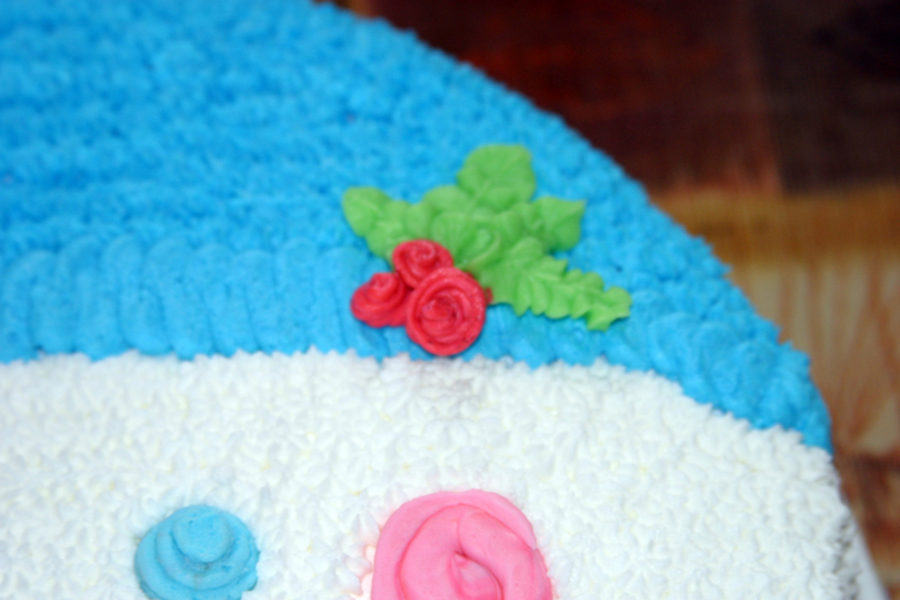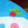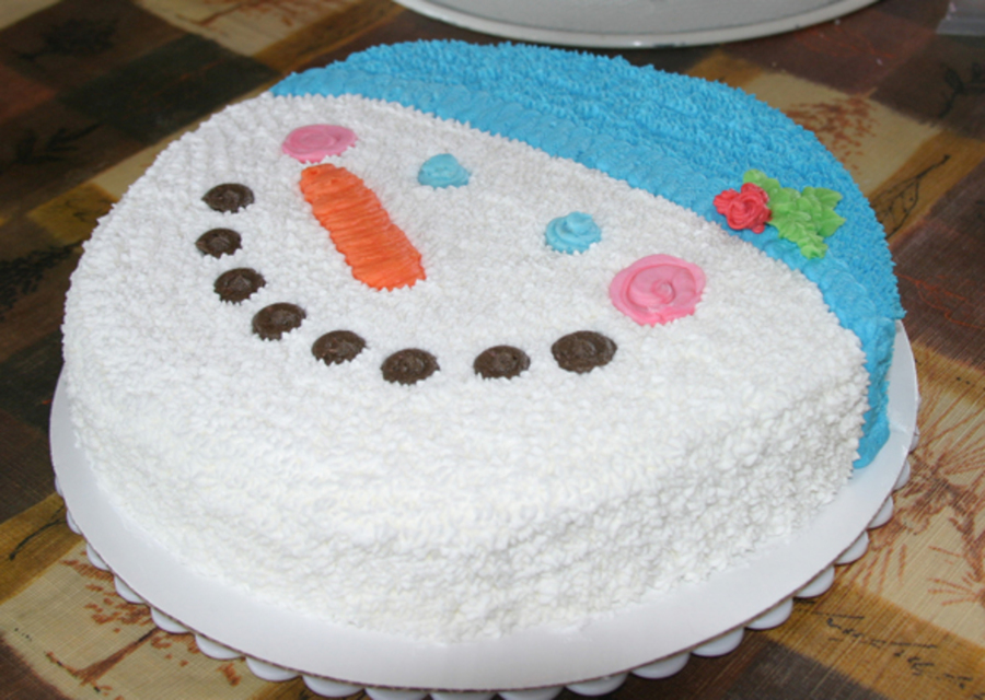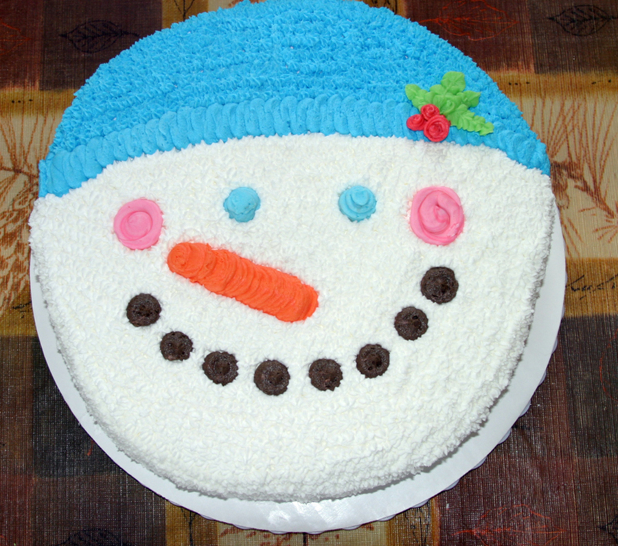 Italian Creme Cake (warning, use wax paper to line your pan to make sure it won't stick! it will not melt or cause a fire and ensures a good turnout on your cake) with buttercream icing (vanilla almond). Simple to make (but very tiring unless you're using the multiple star tip!). No border needed. I found this design in fondant section of another site and knew I could adapt it. I took the photo and using Photoshop, made the photo black and white, found edges and using filters got a basic design pattern. Design was traced to wax paper and transferred to cake (no need to have perfectly smooth icing because you will be covering the whole cake here). The eyes, nose, "coal pieces" mouth and the brim on the hat are piped. Everything else (except the holly leaves and berries) is using a No. 18 star with medium icing. It turned out better than I'd hoped! My fourth cake to make, but it was so easy that I know those who are just starting can do this!