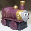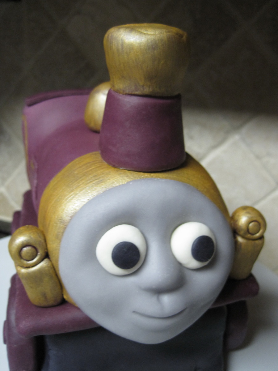 This train is an edible replica of Lady, a train featured in a Thomas the Train movie. She is covered in home made marshmallow fondant. Her wheels and smokestack were sculpted out of Rice Crispy treats and covered in marshmallow fondant, and the gold was painted on with edible paint.