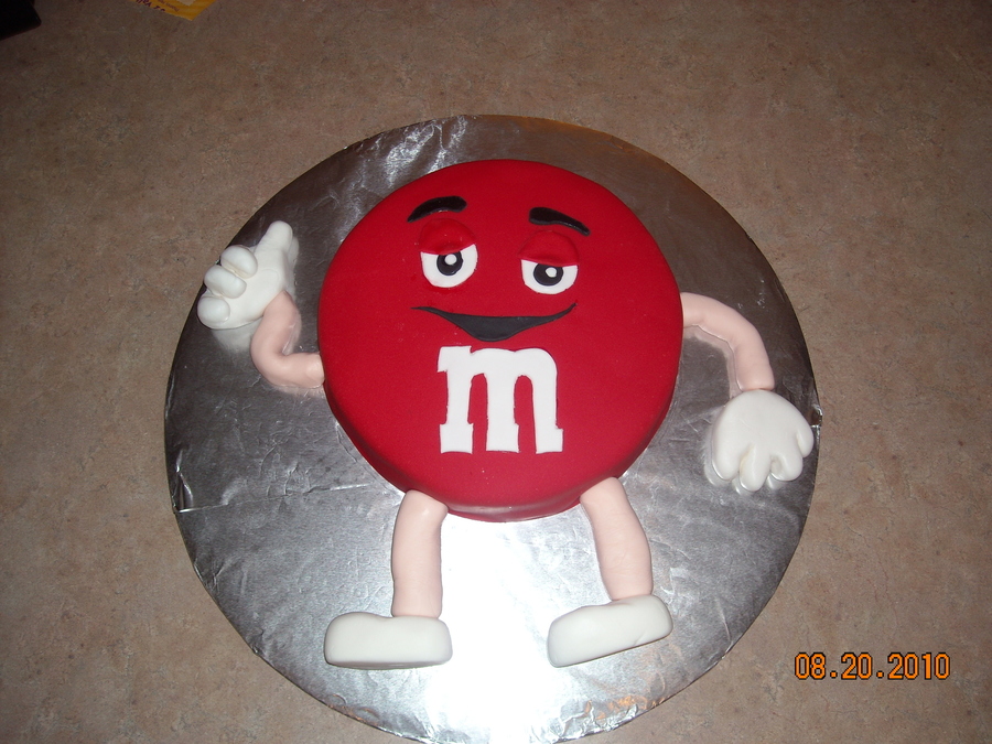 Birthday Cake of Red M & M. Made my own stencils for the eyes, mouth, brows and M. Used fondant to mold legs, arms and shoes.