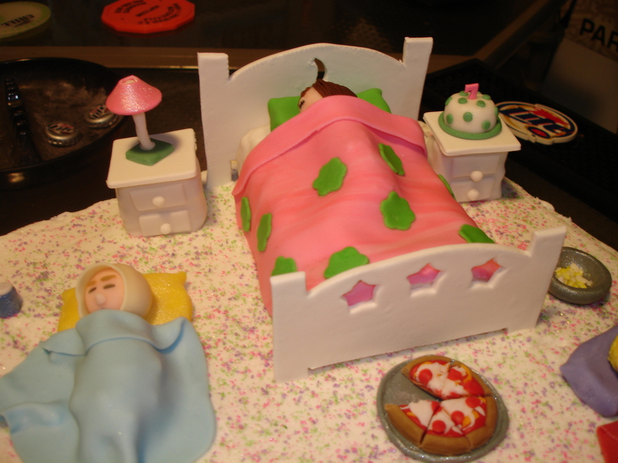 This cake is all buttercream with fondant and gumpaste pieces. The red bean bag chair, 2 nightstands, and bed are RKT, then covered in fondant. TFL!