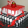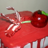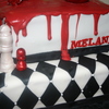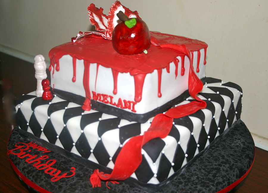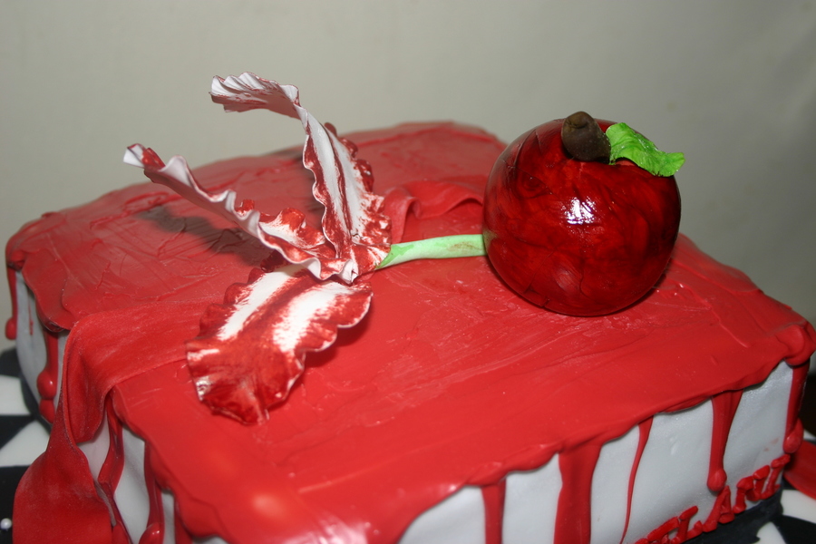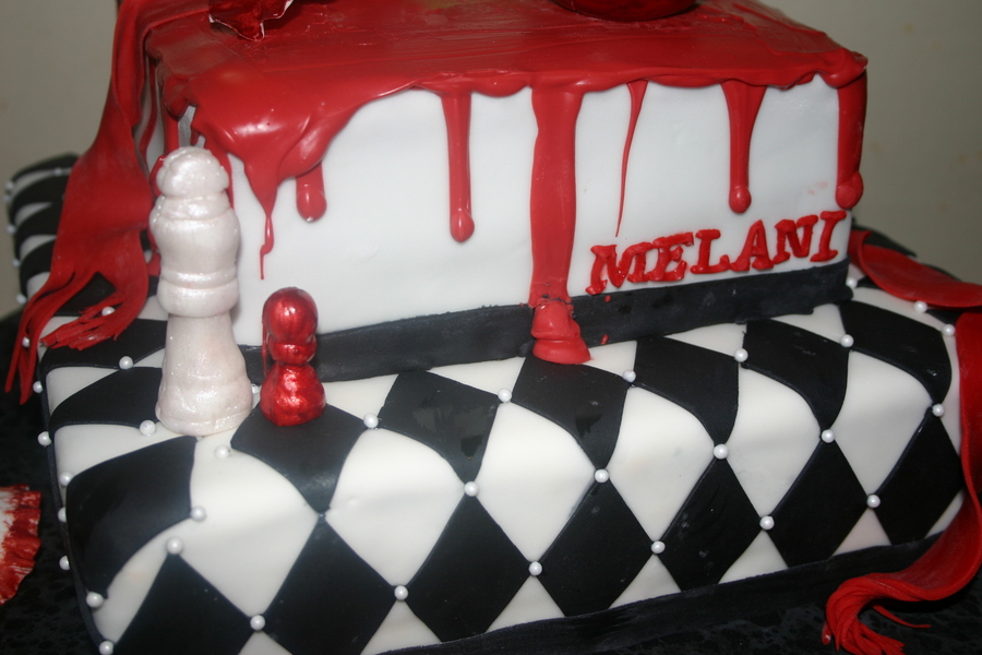 this was made for a Twlight lover . chocolate with chocolate buttercream covered with fondant and pearls. the chess pieces and apple and ribbon are all fondant. the blood melted on the top and running down the sides are melted chocolate ( what a pain ) but looked unique from the rest. one of my favorites by far. hope you enjoy : )