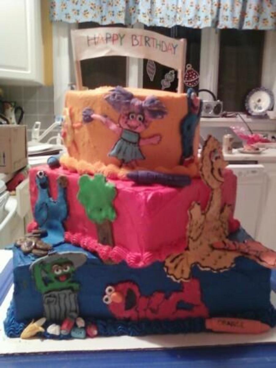 this is a cake my sister and i id together for her 2 kids' birthdays. the characters are painted and cut out of fondant. theres a lot of detal. there is trash by oscar i even made a half eaten apple