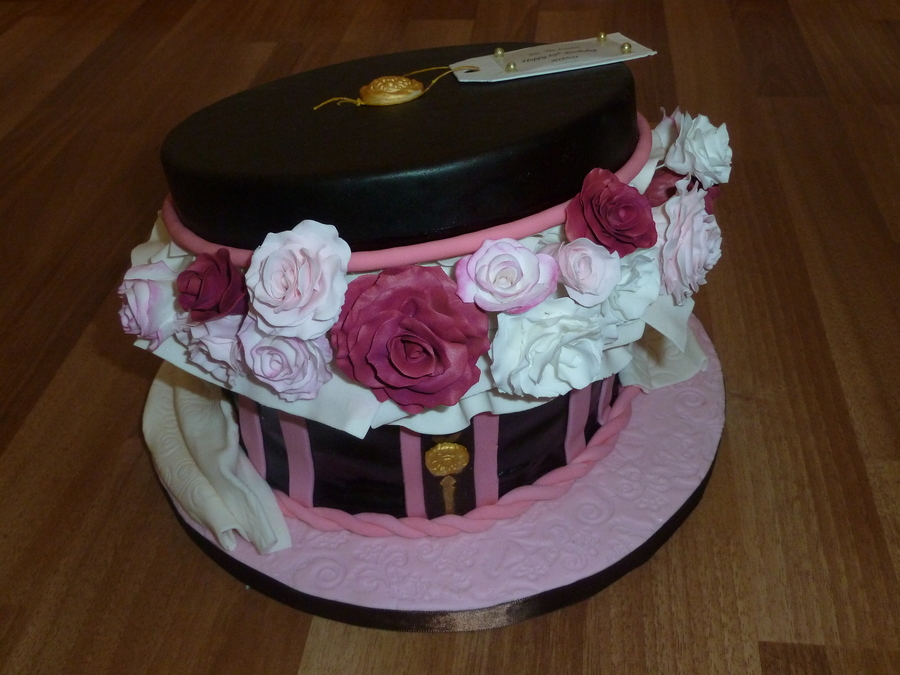 For a 65th birthday. Greatly inspired by DesignerCakes hat box.