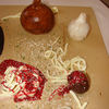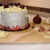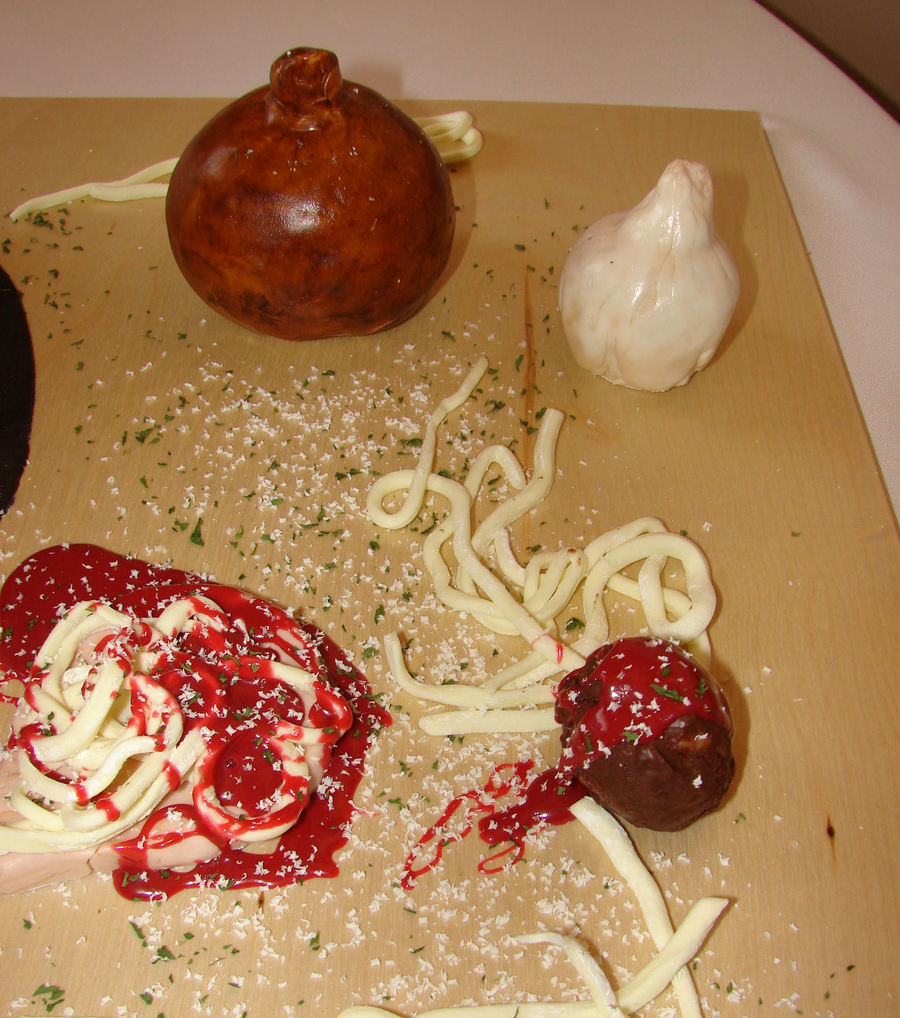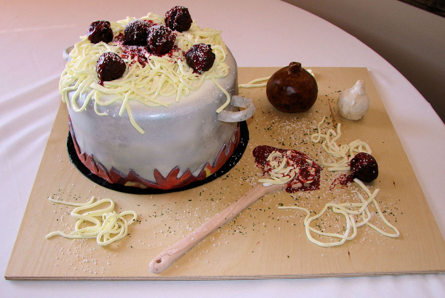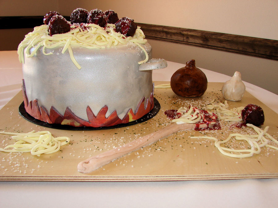 This was a groom's cake I made for my brother's wedding. He loves to cook and Italian is his favorite, so it seemed like a perfect idea. Onion and garlic are made from cereal treats covered in fondant. Spoon is gumpaste. And the meatballs are chocolate-covered cereal treats.