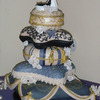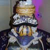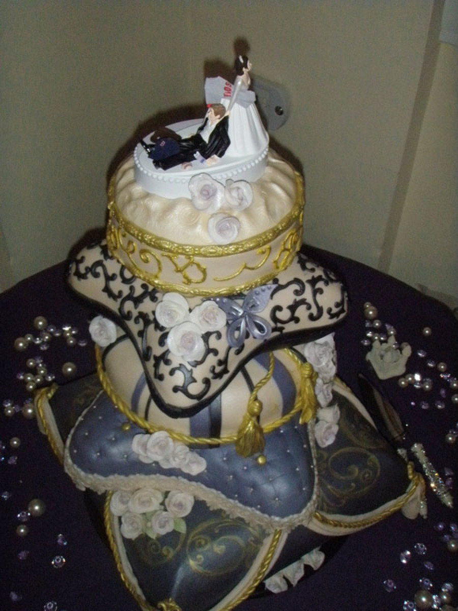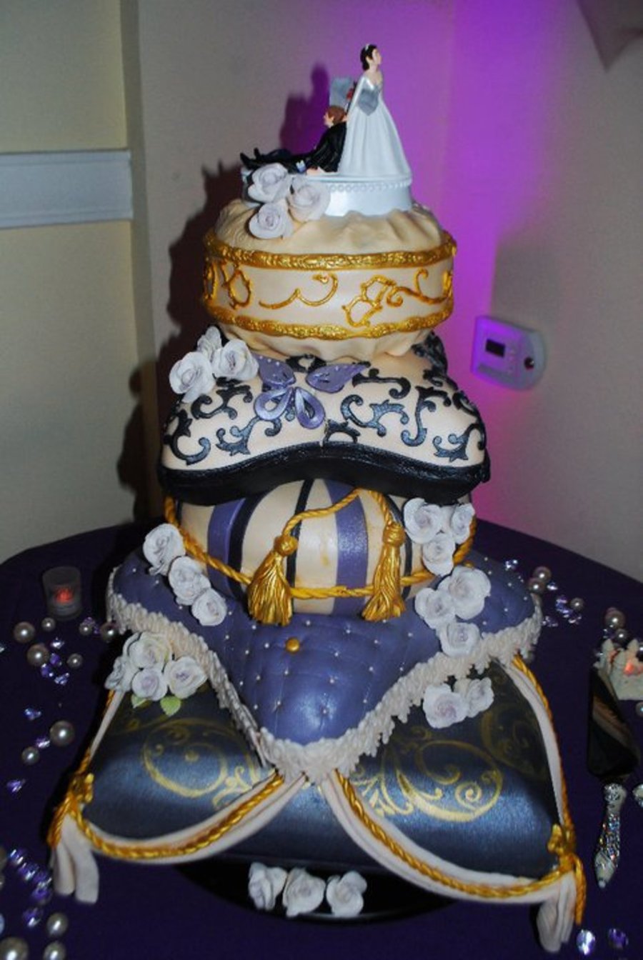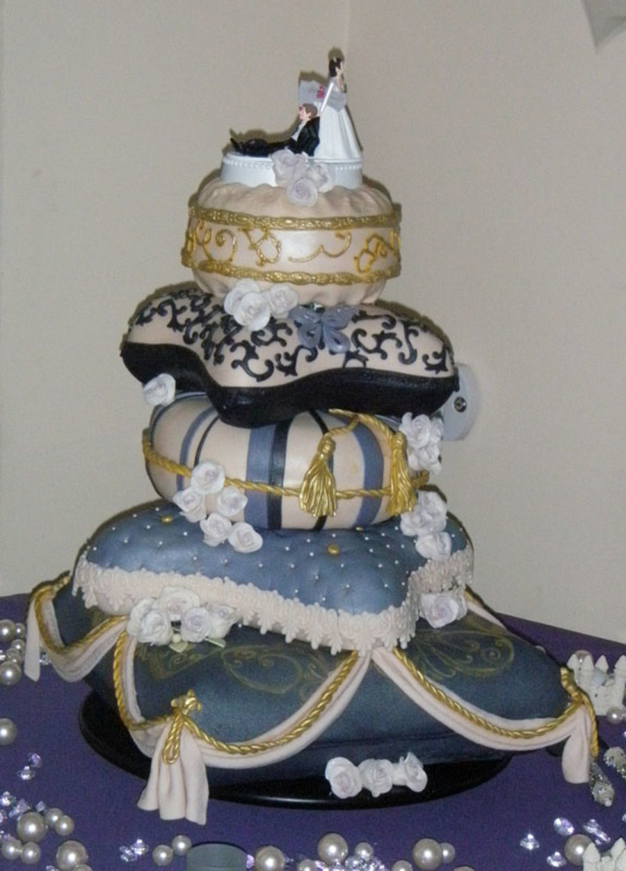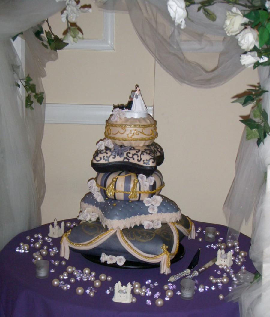 8' carved round choc mud, 10' wilton pillow marble mud, 11' carved round white choc mud, 13' wilton pillow red velvet, 17' styrofoam pillow ordered from thefoamstudio The decorations used impression mats, custom bead silicon mold, wilton pattern press set, triple scroll cutter country kitchen sweet art, margaret braun tassel and braid instruction from cakewalk book, earlene's enhanced betty lace mold. Thanks!!