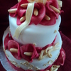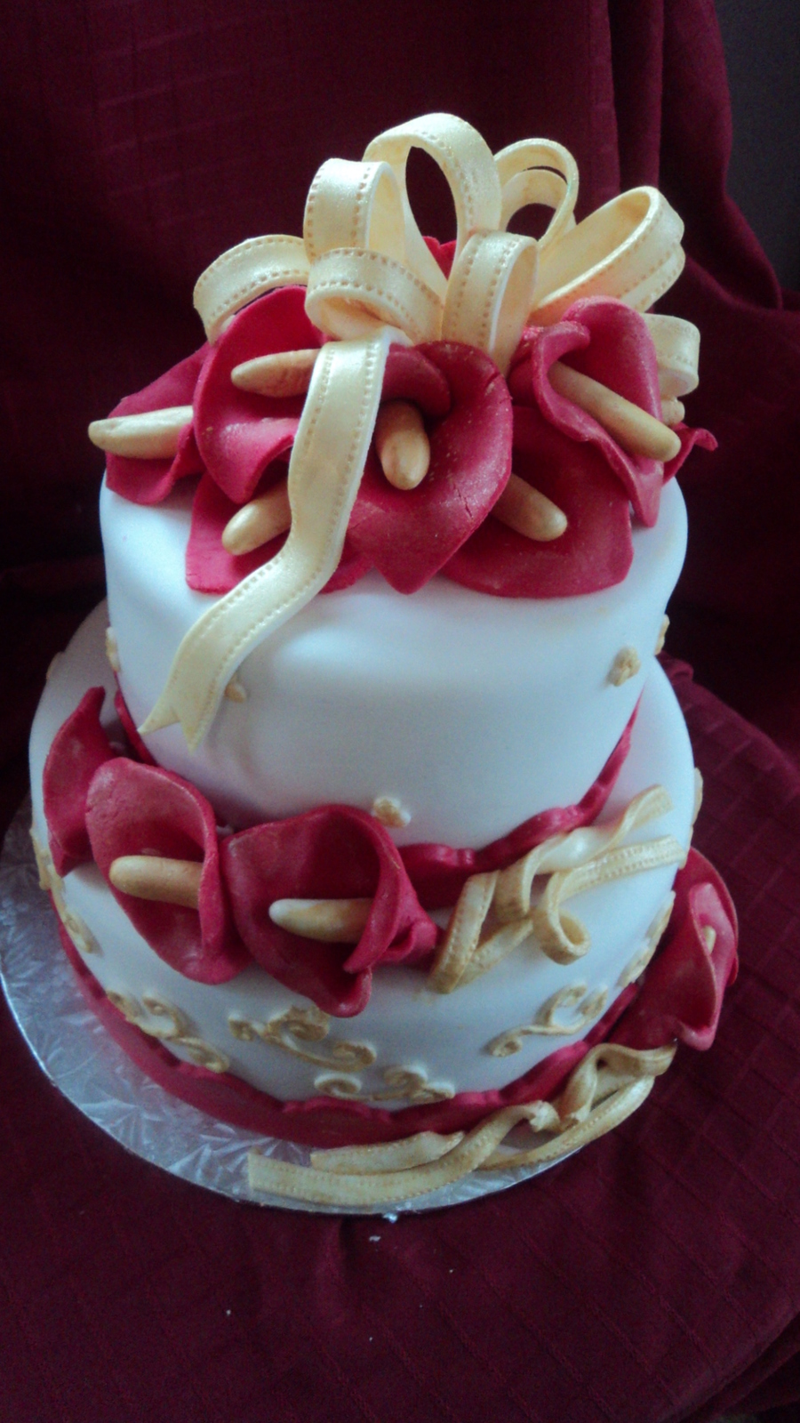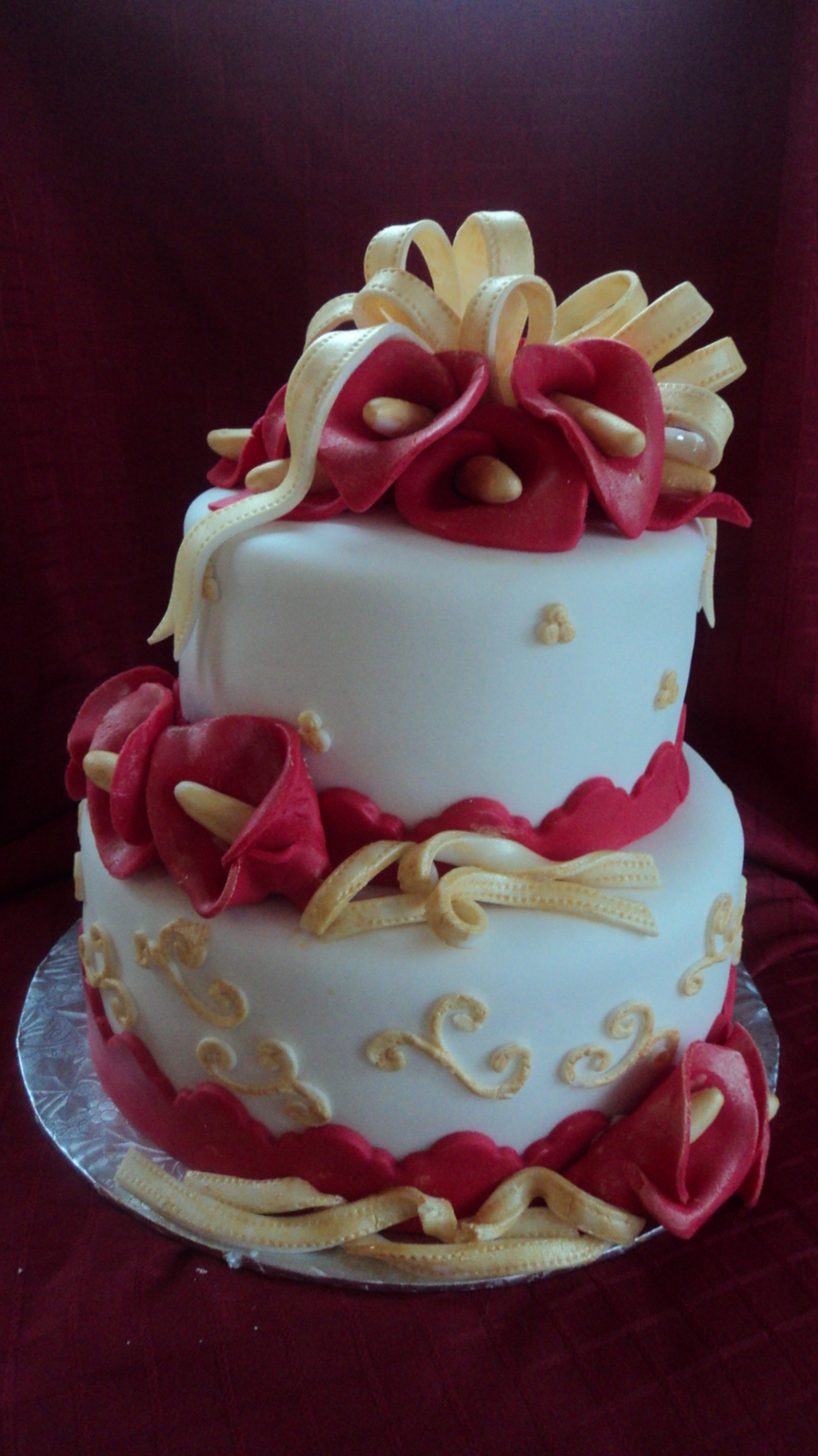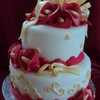 Red Calla Lillies & gold 'ribbon' and piping. This cake was NOT crooked but for some reason the angle of the pic makes it look so.