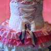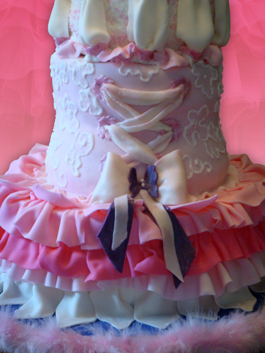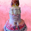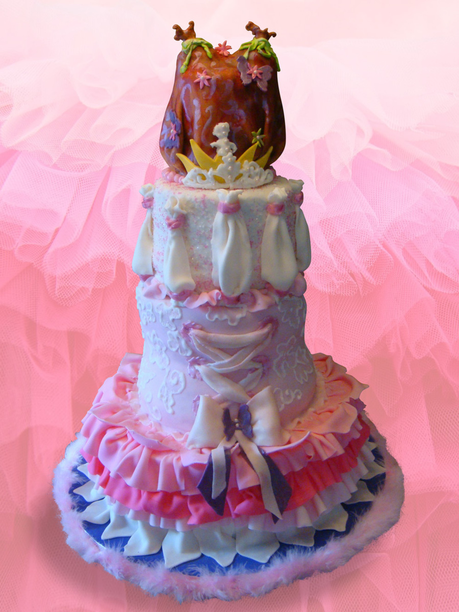 Here's my little girl's Fancy Nancy cake! Also my first experience with SPS, though it wasn't a true SPS cake through and through (bottom tier was a cake dummy, and very top tier was 4 inches and I didn't see a plate that size :) ). The very top tier is the messy "hairdo" that Fancy Nancy always fills with butterflies and flowers and glitter and other pretty sparkly things. SO much fun to make!!!! I loved it that there was no way to overdo this cake ... when my elaborate royal icing tiara fell apart, I threw a simple fondant cut out one on the "hair" and mounted the highlights of the tiara on top. Alternating layers of raspberry and blueberry with strawberry and cream fillings in the corset tiara; peaches and cream for the other two tiers. Special thanks to Peechekeeno and Grammasue for their awesome help with the tutu!