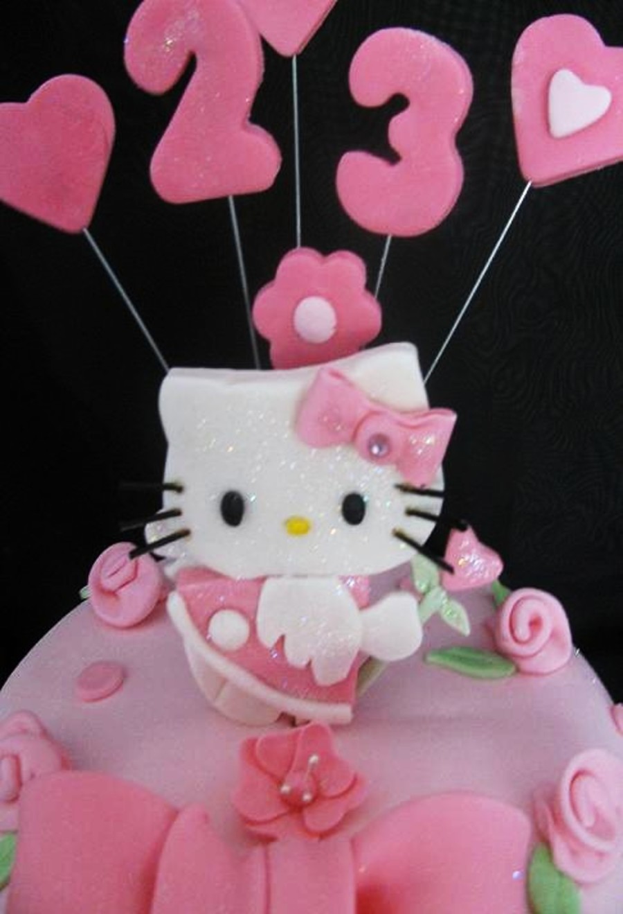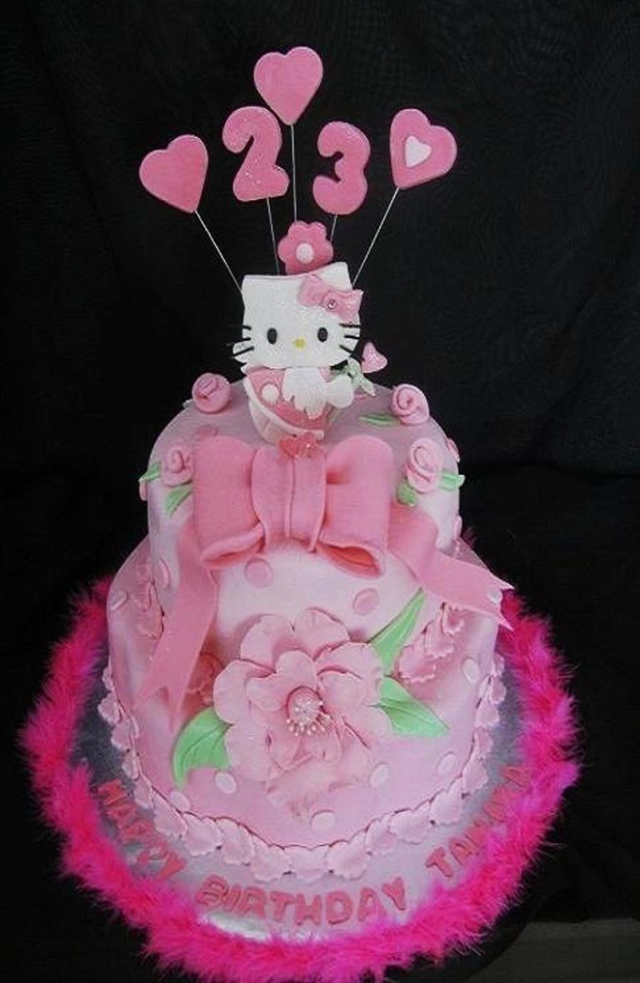 Client gave me a picture of the kitty she wanted..Hello kitty is made out of gumpaste and so is the bow and large flower. I love doing girly cakes