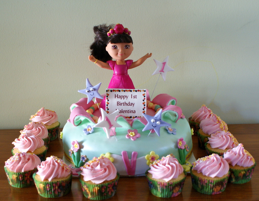Dora the Explorer and Cupcakes, Dora is a Doll for the Little birthday girl to keep everything else if edible Marble Cake and Fondant. TFL