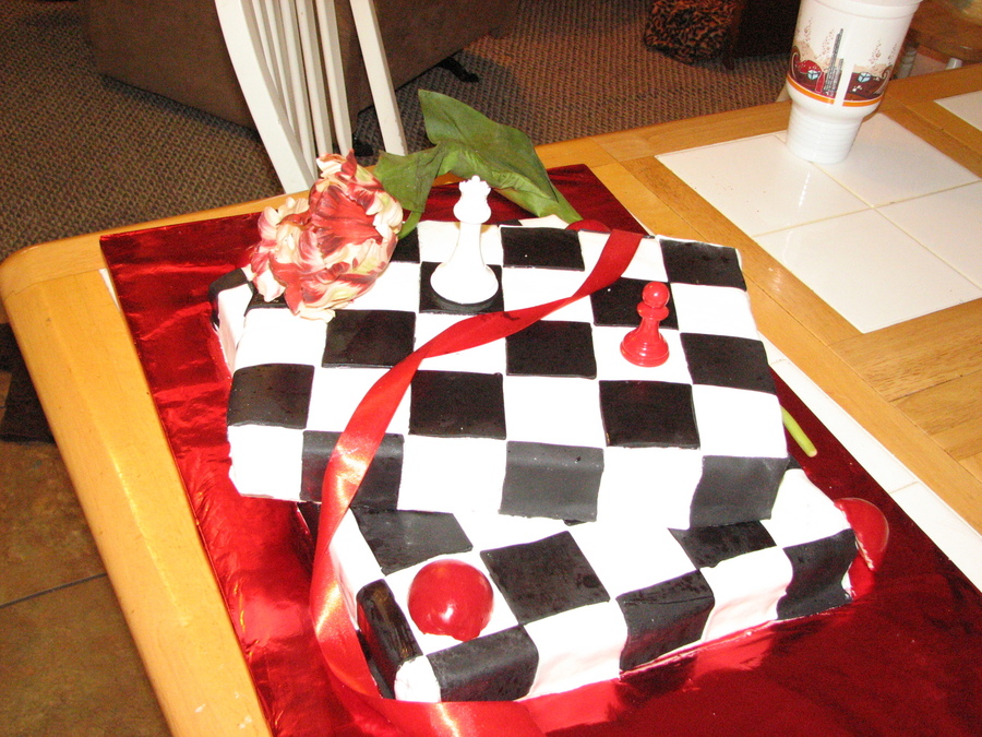 Made for my niece who is in love with the twilight stuff. Made 1/2 sheet cake and 1/4 sheet cake on top. Chocolate cake with checker board style. The apple is white chocolate.
