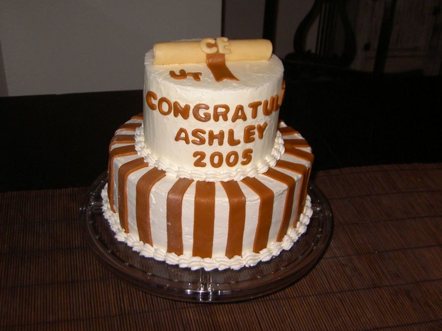 I made this for a friend's graduation from UT (the school colors are burnt orange and white). The bottom is chocolate cake and the top is a cake dummy. The decorations are fondant
