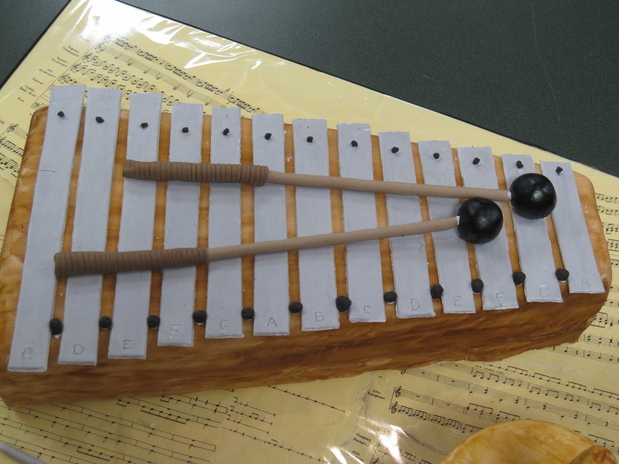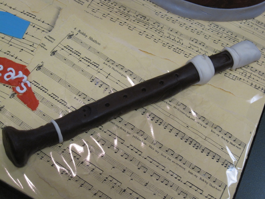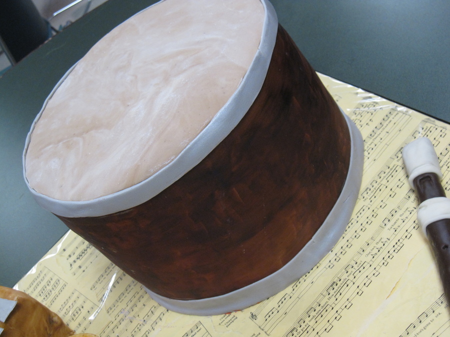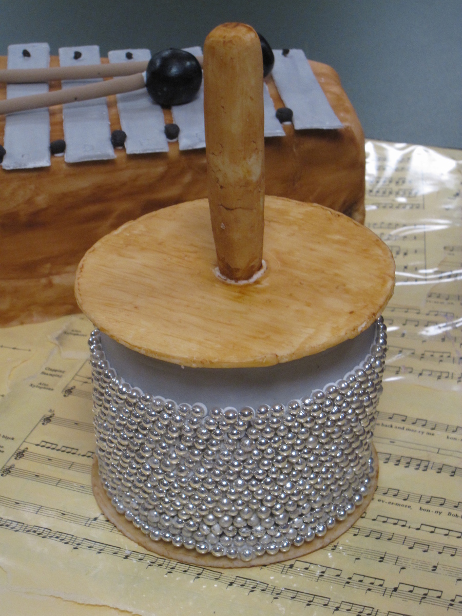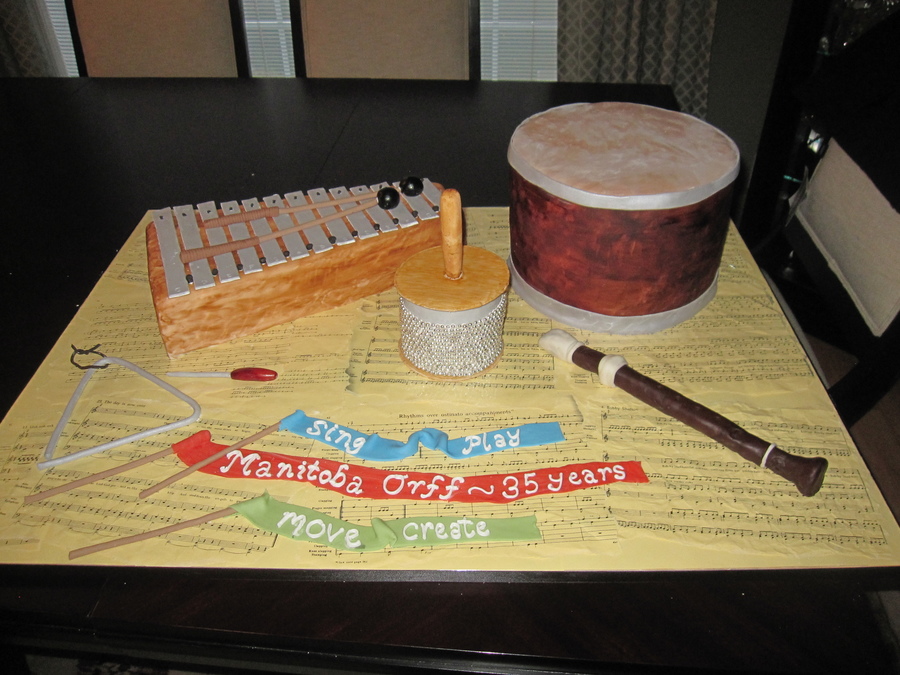 I made this cake to celebrate 35 years of Orff (Music education for early years) in our province. The drum is a 10" double barrel cake (7" high) tuxedo cake with chocolate ganache, the xylophone is lemon poppyseed with caramel filling. The recorder was made with rice krispies and modeling chocolate. The kabassa has over 600 silver dragees on it! All other accents are gumpaste. TFL!