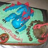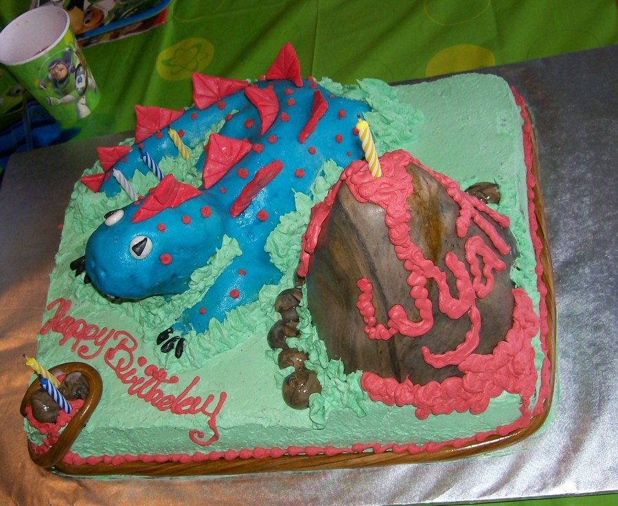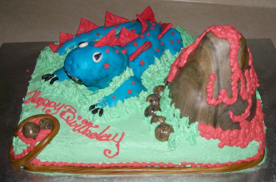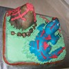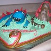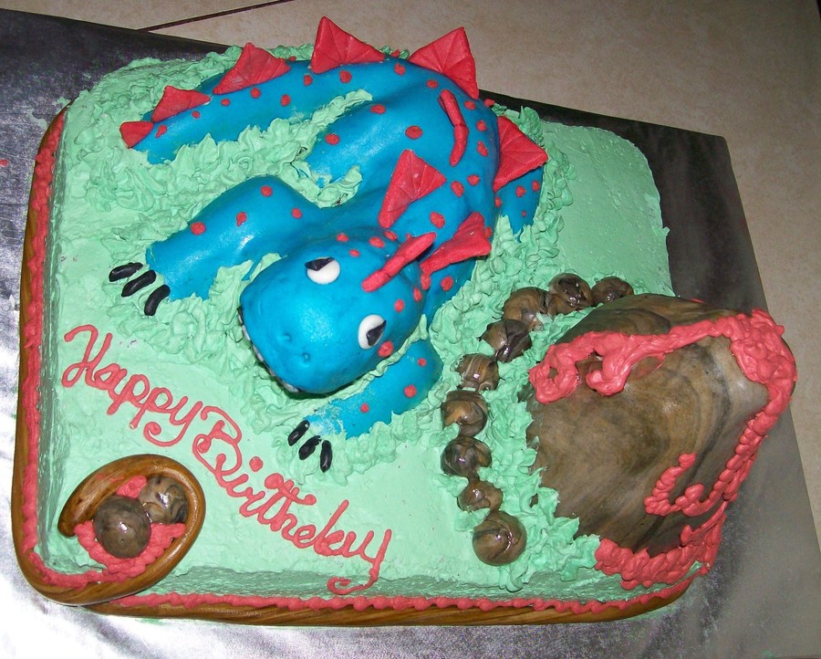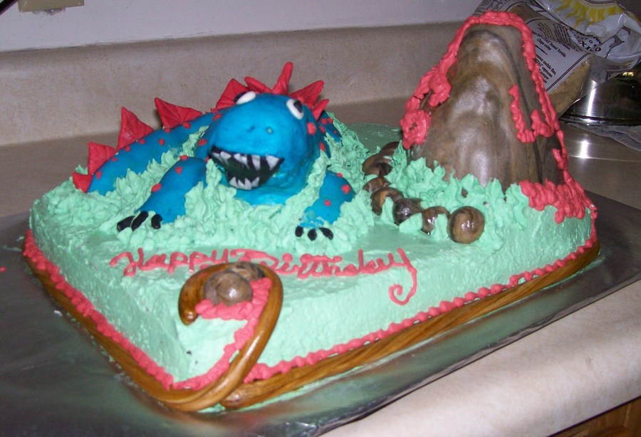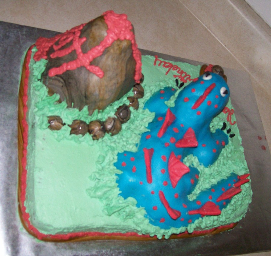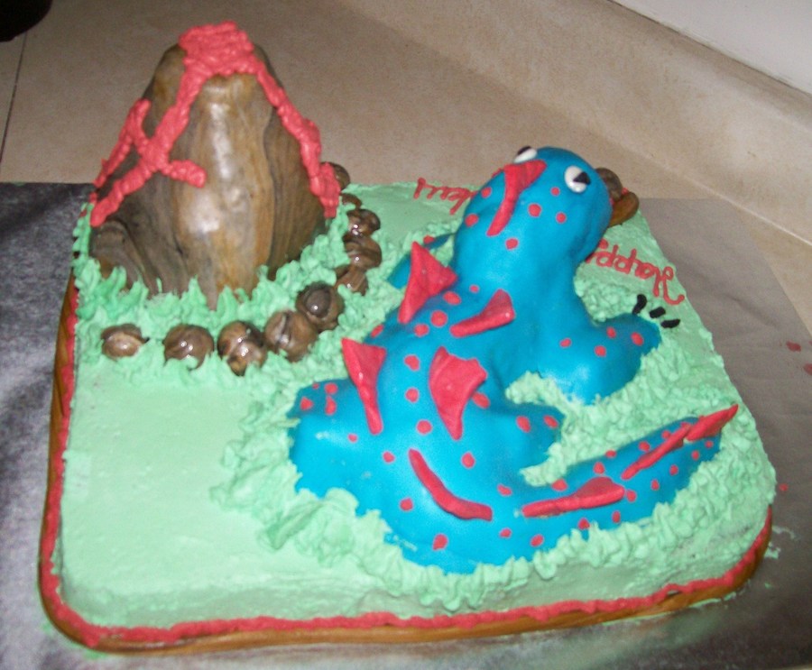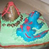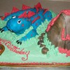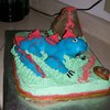 This was a Homemade Chocolate Mayo Cake with a Rice Crispies Treat Dinosaur Covered in MMF. The rest was frosted in Homemade "best creme" Frosting.