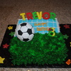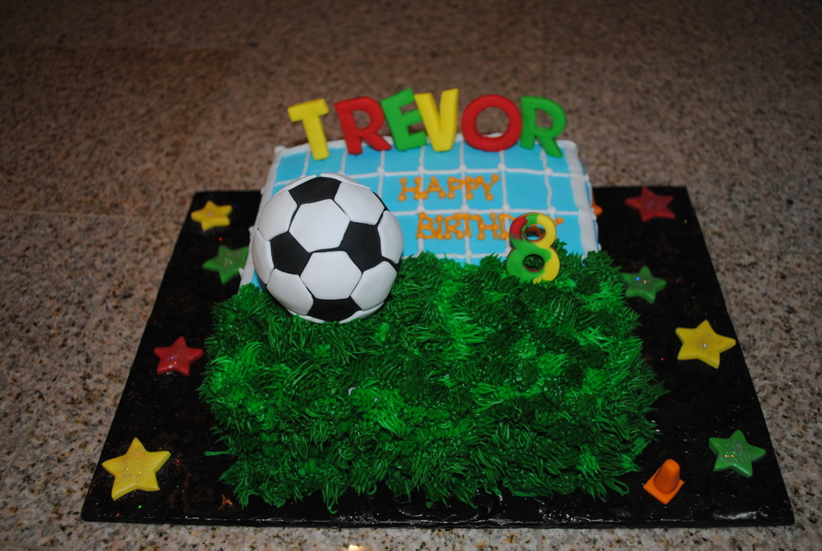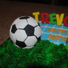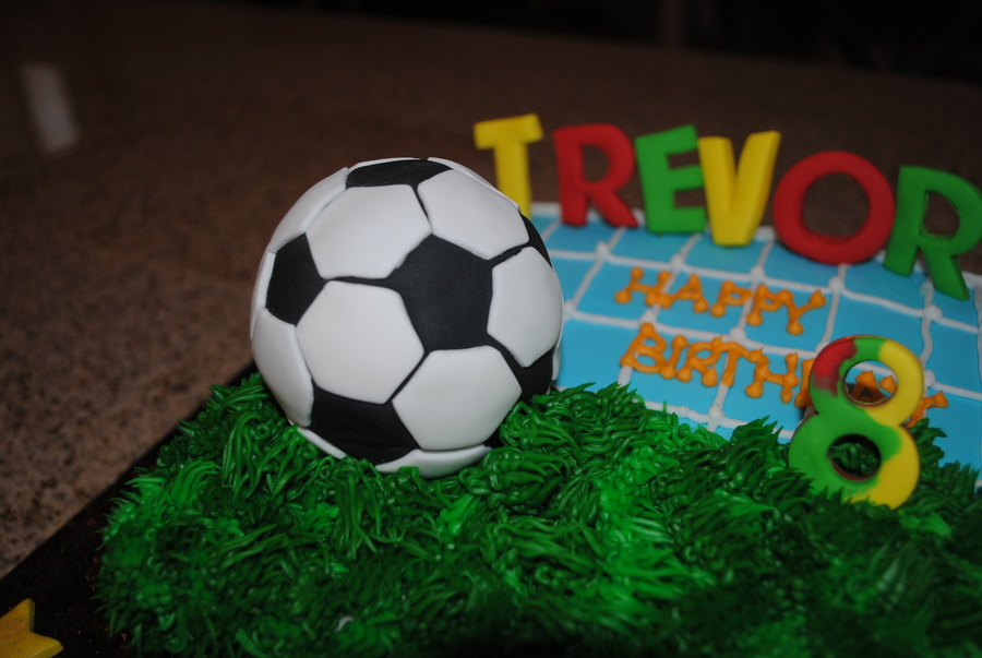 8 in square cake covered in half fondant and buttercream for grass. Ball is formed from RK treats! Fun and easy!