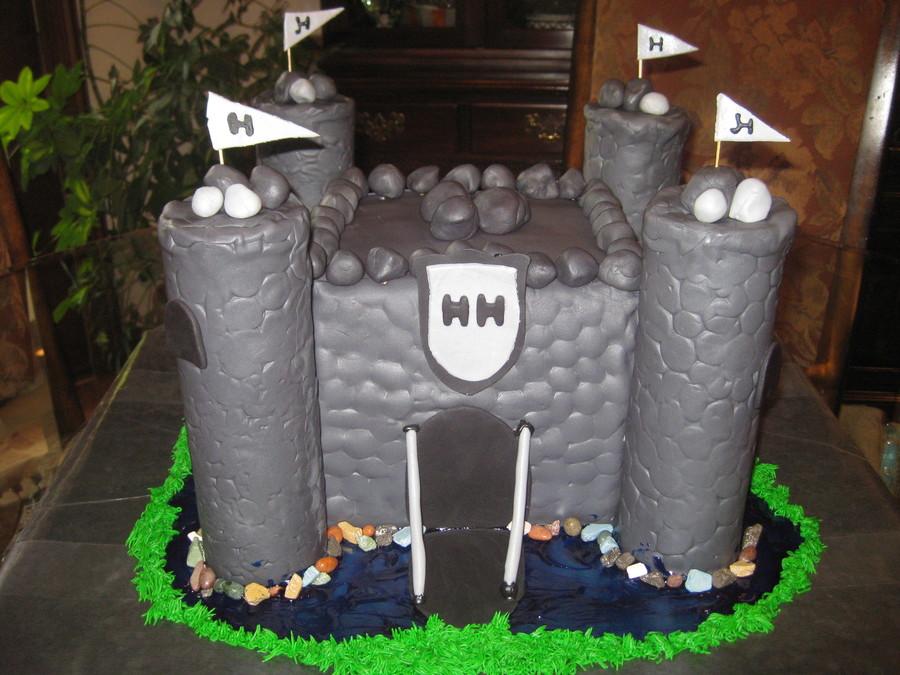 I LOVED doing this cake! It was for a friend's son. For the cake I used 4 8x8 square WASC with buttercream between and covered in fondant. Large rocks are fondant. Also flags, crest and draw bridge are all fondant. Small rocks around the bottom are chocolate rocks. The towers are actually pringles cans covered in fondant. Moat is piping gel with blue coloring. TFL!