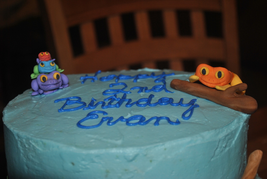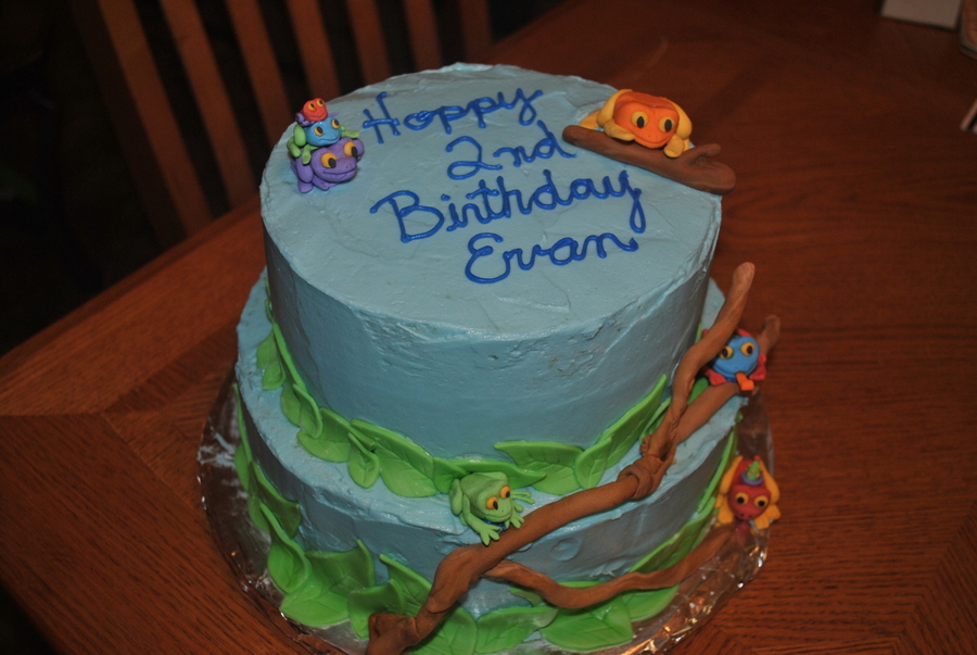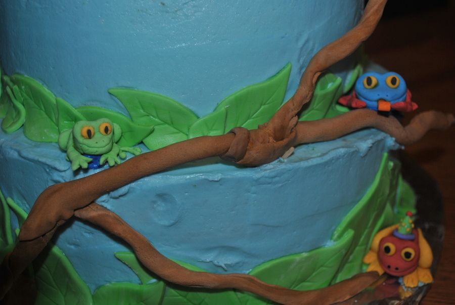 Tree frog cake w/ buttercream icing and fondant leaves and tree branch with gumpaste frogs.