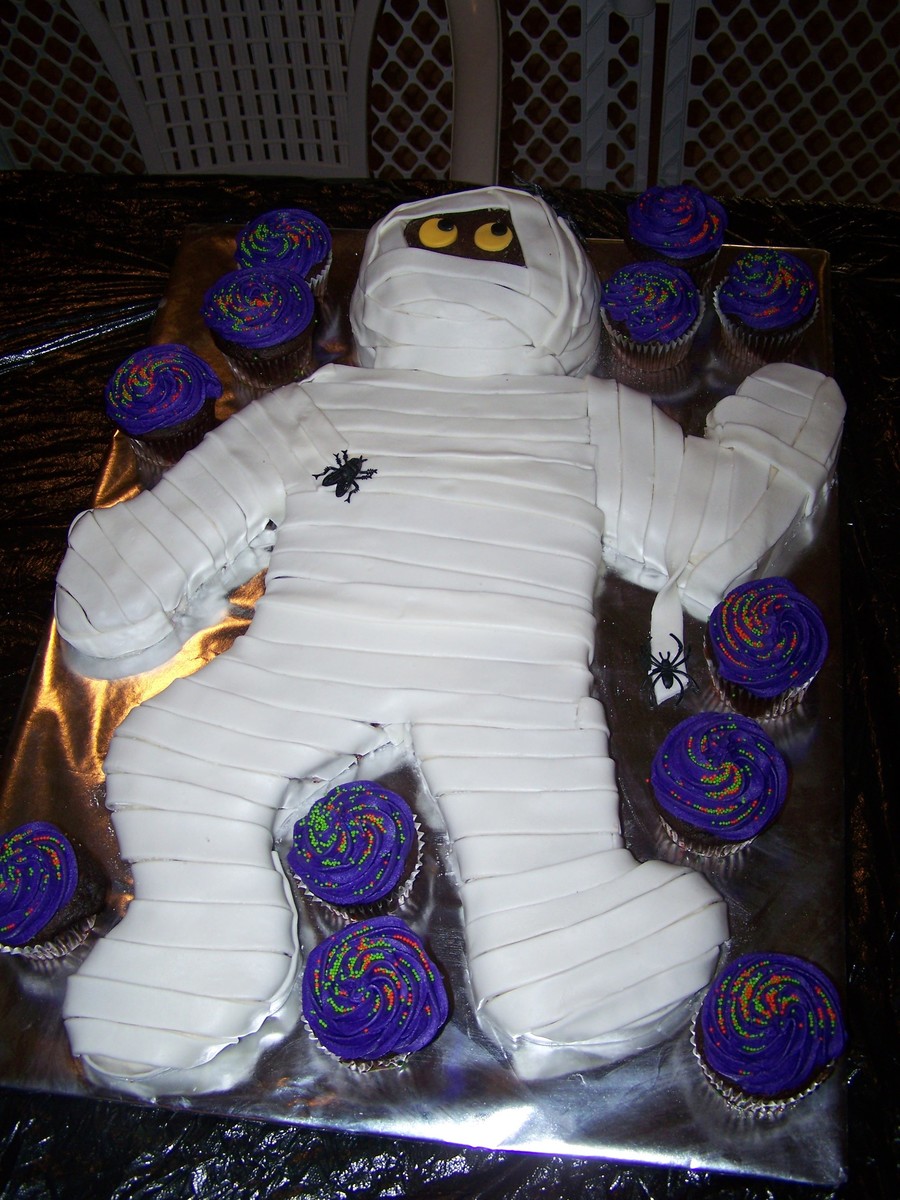 I have done Mummy cakes before of just the head, but decided to do the whole body this year. Just chocolate cake with MMF and a few cupcakes for extra servings.