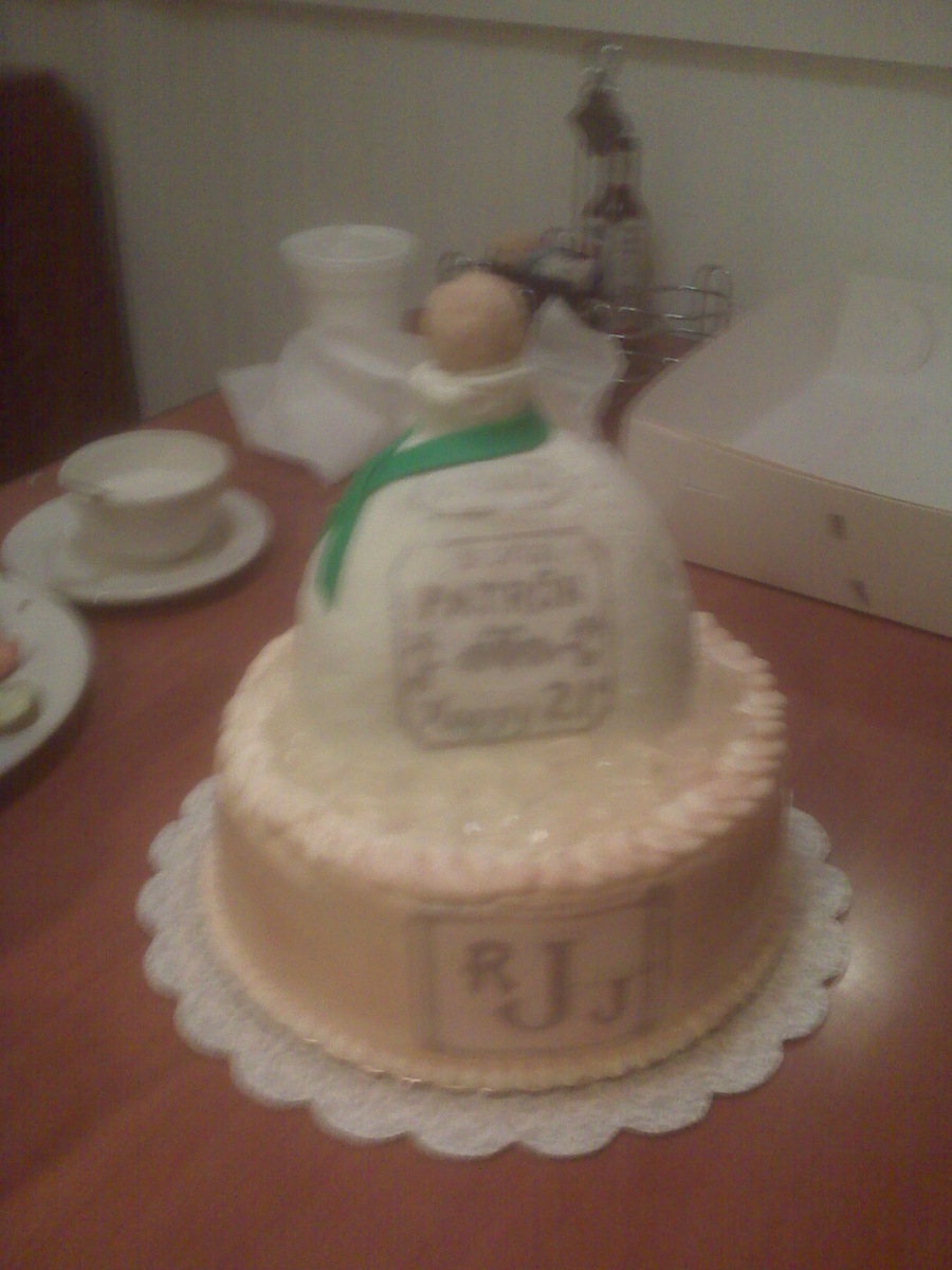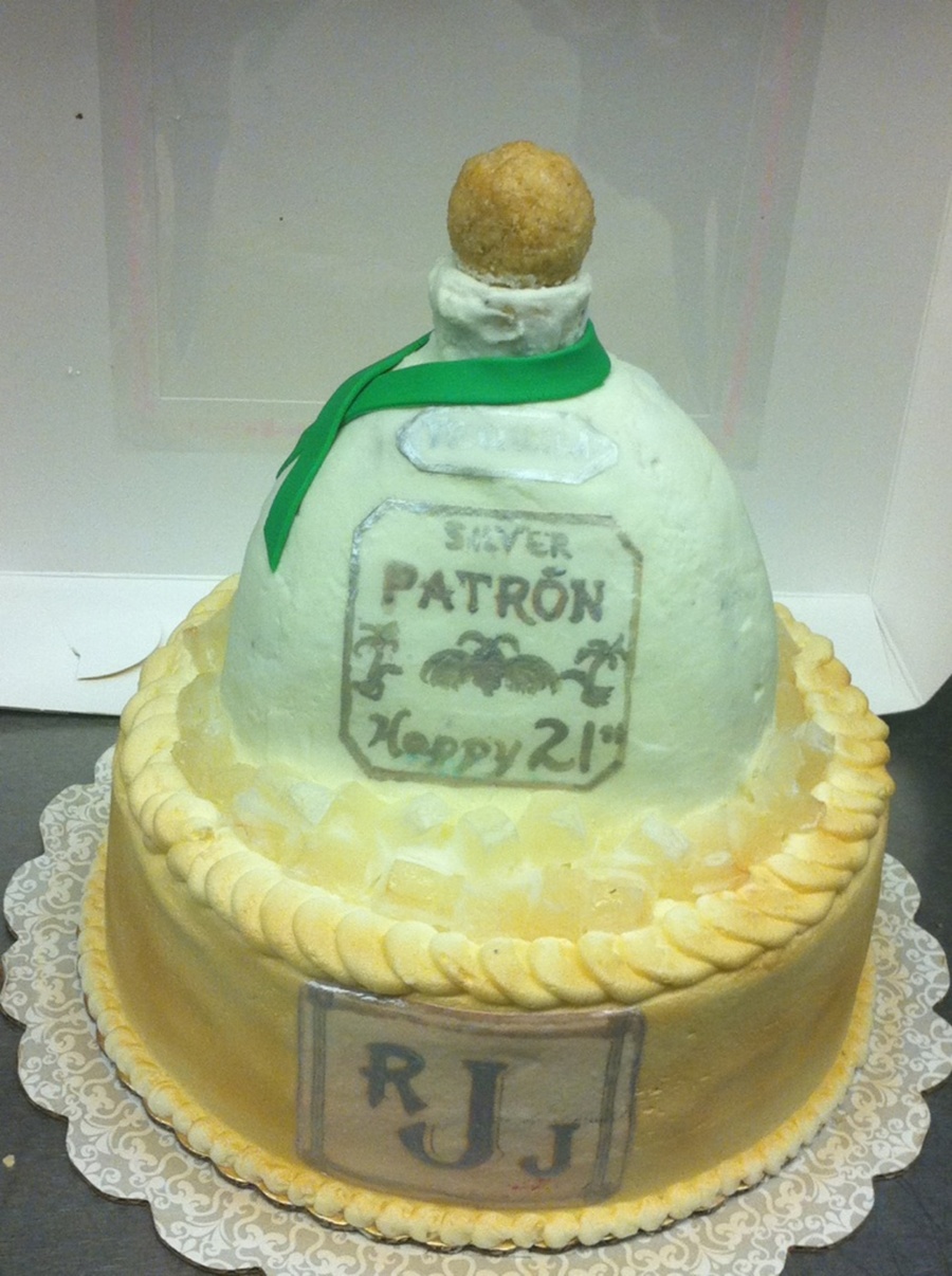 My "baby's" 21st birthday!!!!!! A Patron bottle (that started out as a Royal Crown bottle that broke!). I decide to borrow inspiration from another CCer and stick it in an ice bucket and turn it into Patron! All buttercream (he hates fondant!). Handpainted labels and monogram.