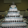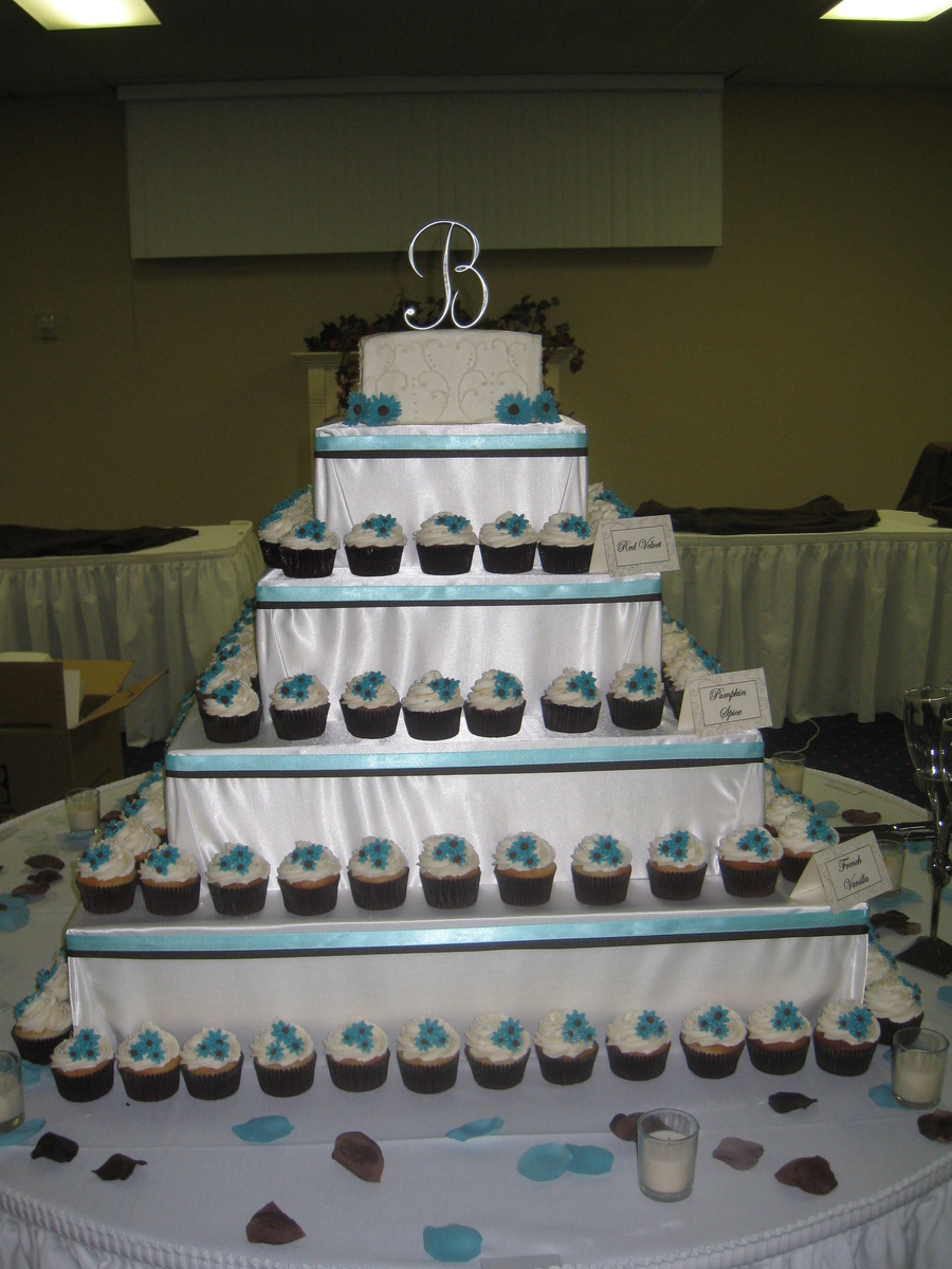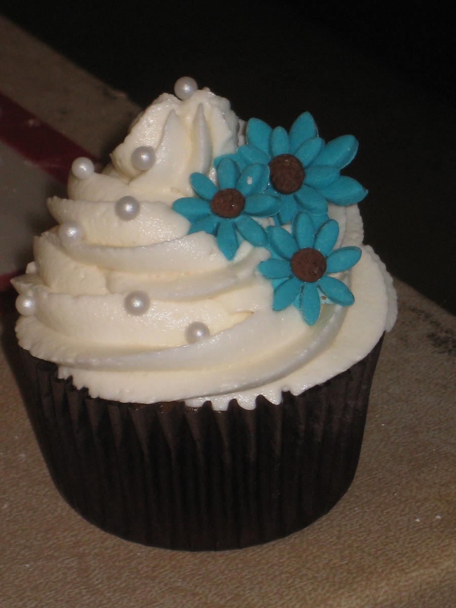 handmade fondant daisies and sugar pearls. These cupcakes went on a large cupcake stand for a wedding. I made 330 of these!