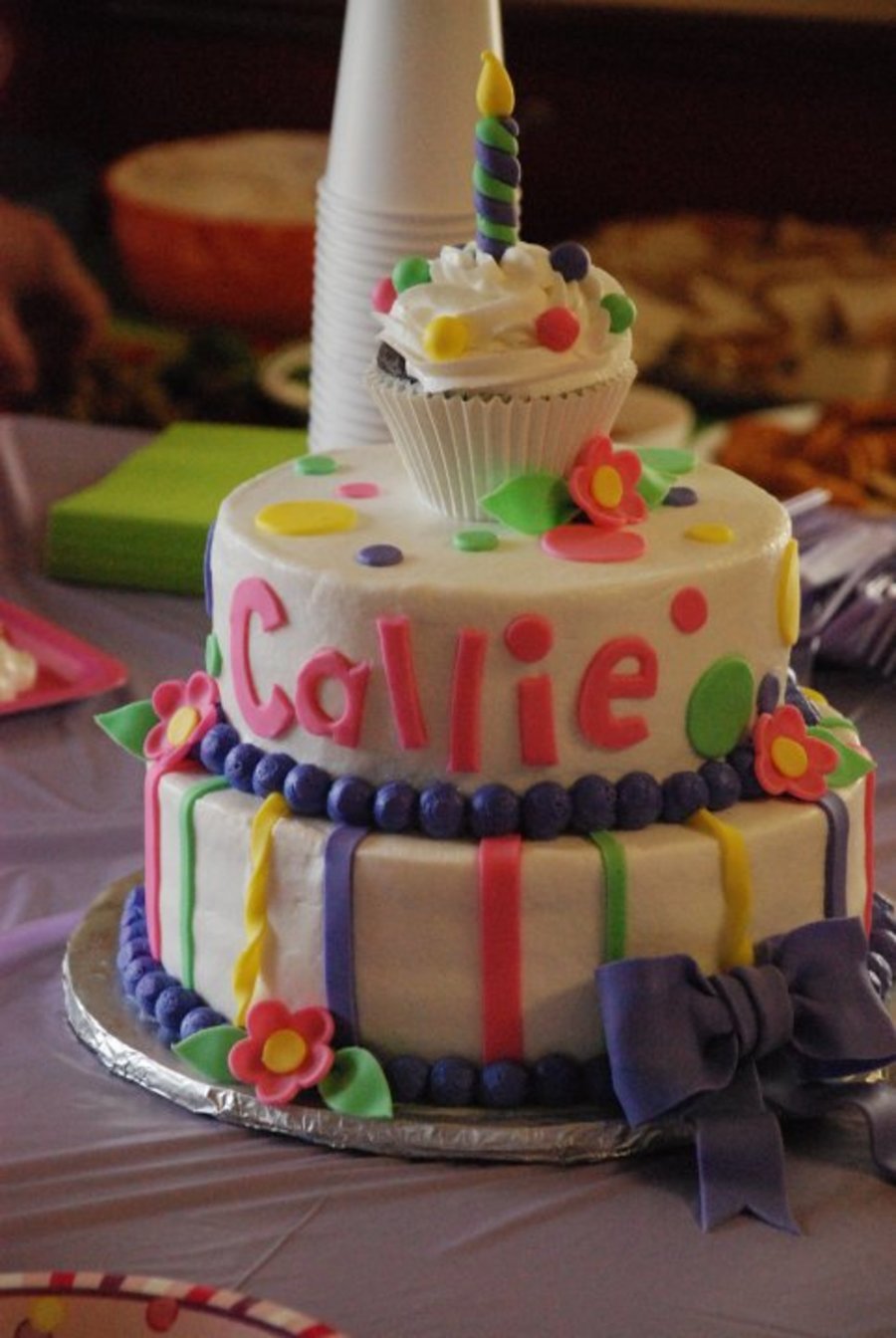 I made this for my niece's first birthday. The cupcake was her smash cake. The cake was frosted with buttercream. Decorations are fondant.