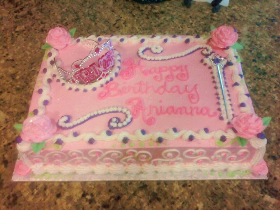 1/2 sheet cake with the ever popular Princess Theme! All frosted and decorated with Pastry Pride. Tiara and wand were provided by the princess's mom and are plastic. Green leaves are wafer paper.