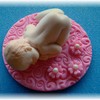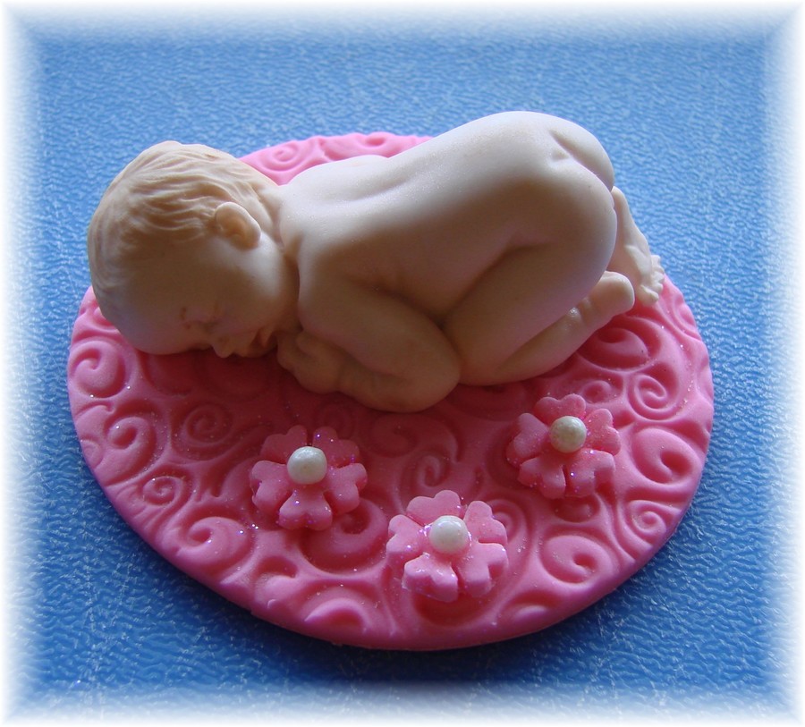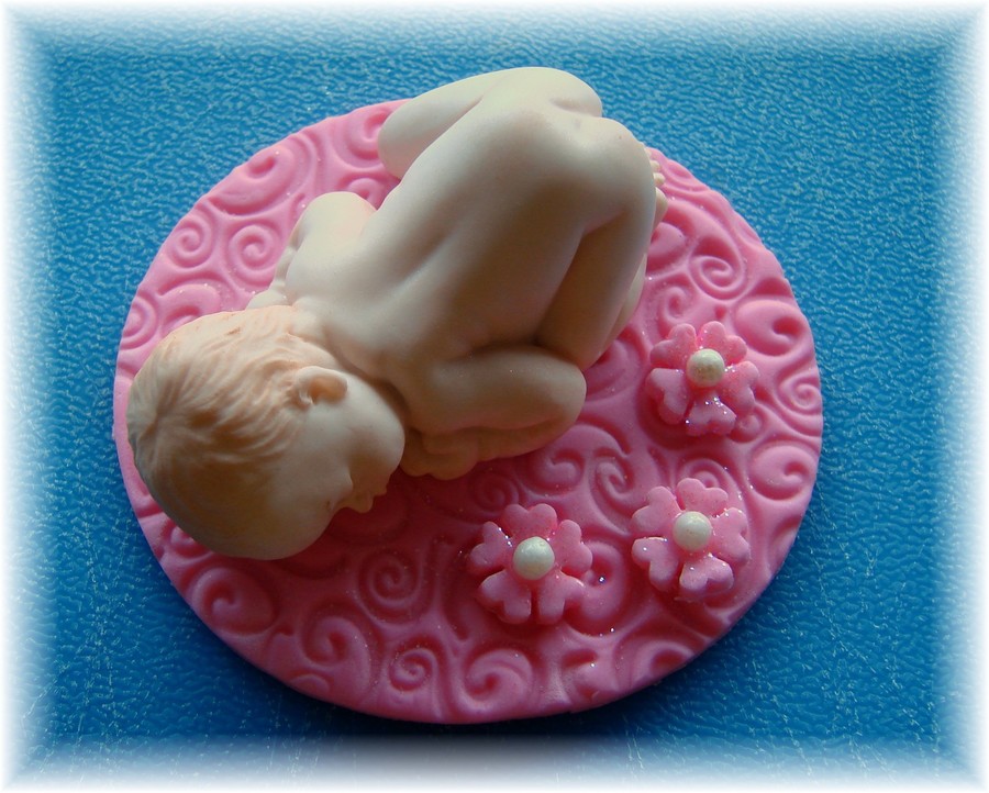 I just love making babies with this mold. I am working on my flesh tone and am almost satisfied. This was an order due tomorrow. Made with Gumpaste and fondant mixture. Baby is sitting on a fondant disk that I used an impression mat on. The mat and flowers are lightly dusted with pink disco dust.