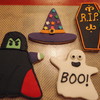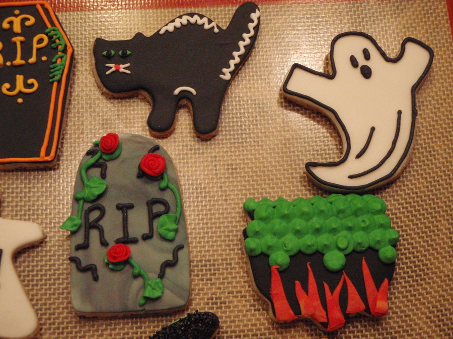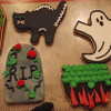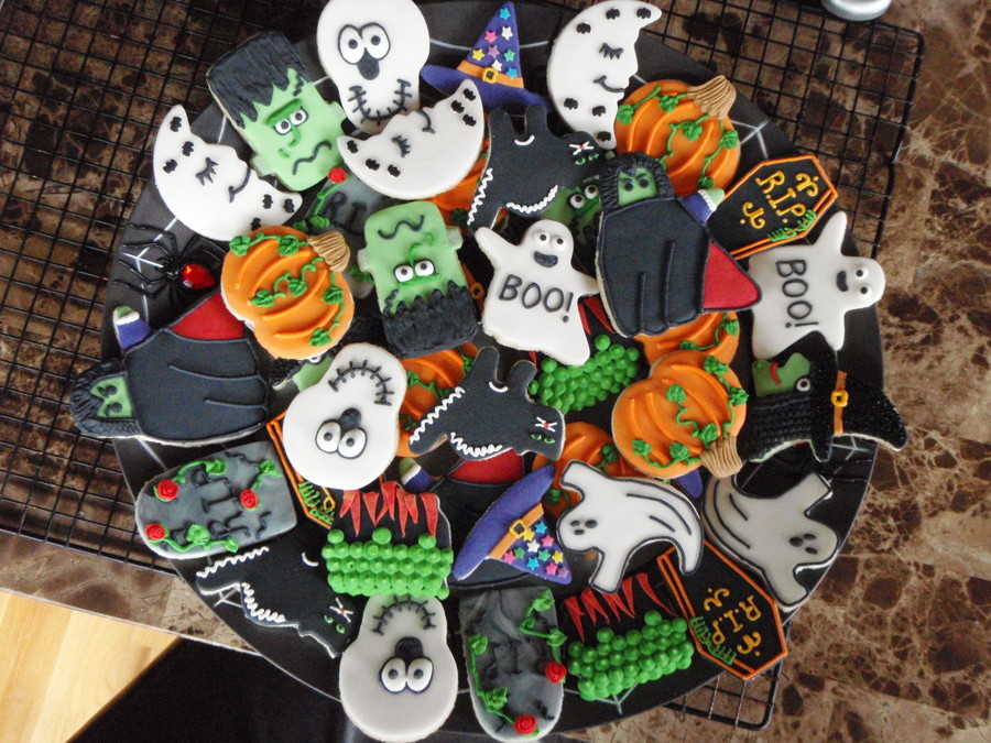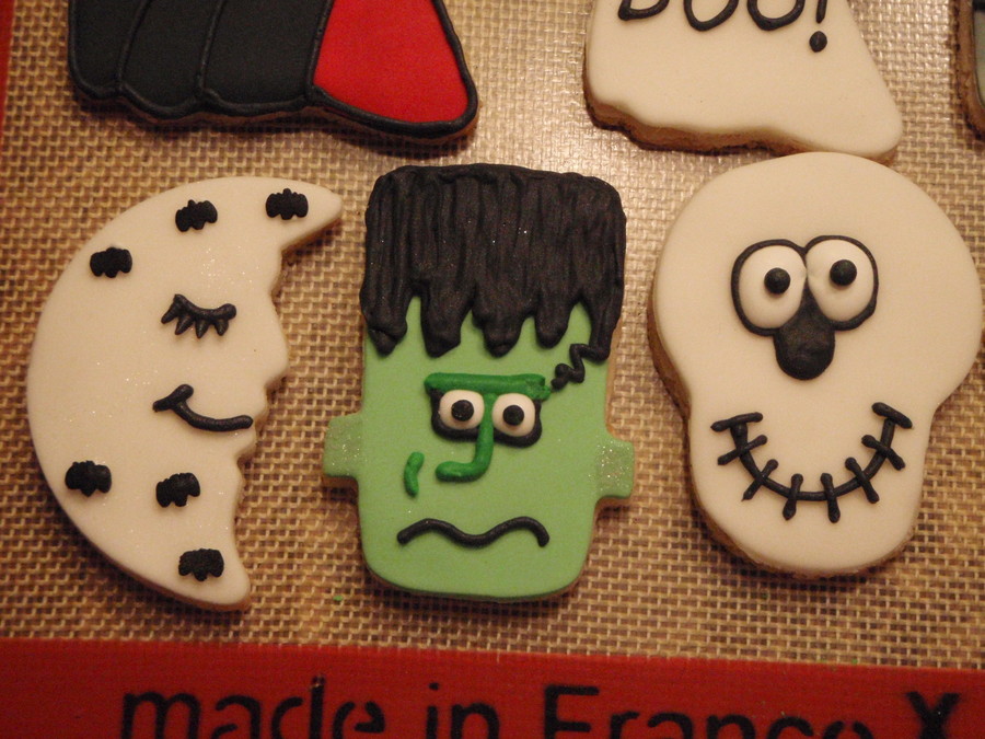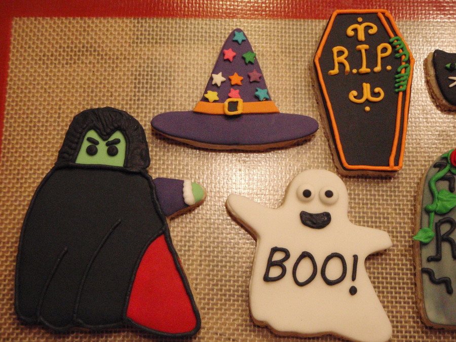My assortment of Halloween cookies. They are covered in fondant and decorated in royal icing.