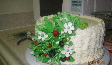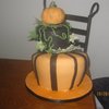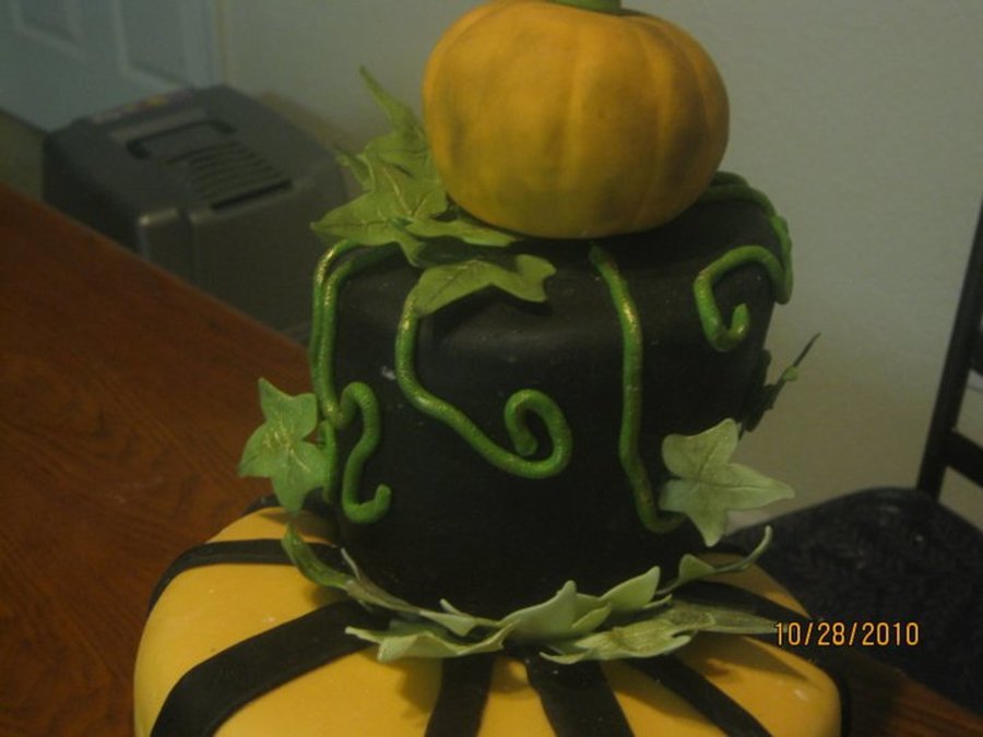 This is a pumpkin spice cake with buttercream frosting covered in fondant. The pumpkin is made out of rice krispie treats and the leaves are made out of gumpaste.