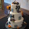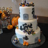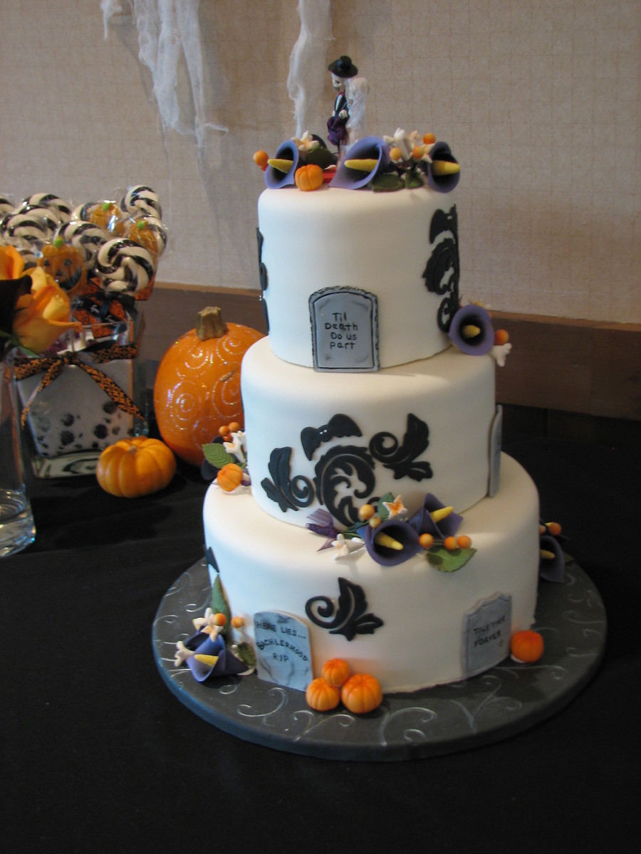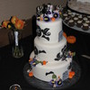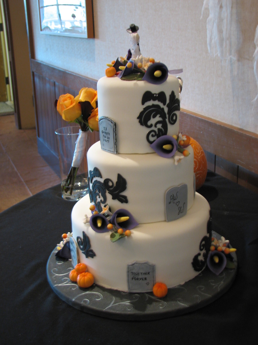 Two of the sweetest people were married last night, & it was an honor to make their wedding cake. He is a chef and she is a pastry chef - I was astounded when they requested that I do their cake. Halloween theme, bride requested a traditional look with Halloween elements and specifically asked for tombstones. MMF with gum paste decorations. Base was covered with black fondant, scrolls were embossed then painted with silver AmeriMist airbrush paint. Delivery was stressful - had to slam on the brakes in traffic. TFL