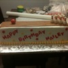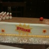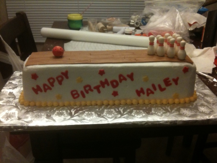This was a birthday cake for a bowling party. The pins, ball and aisle are made of fondant.