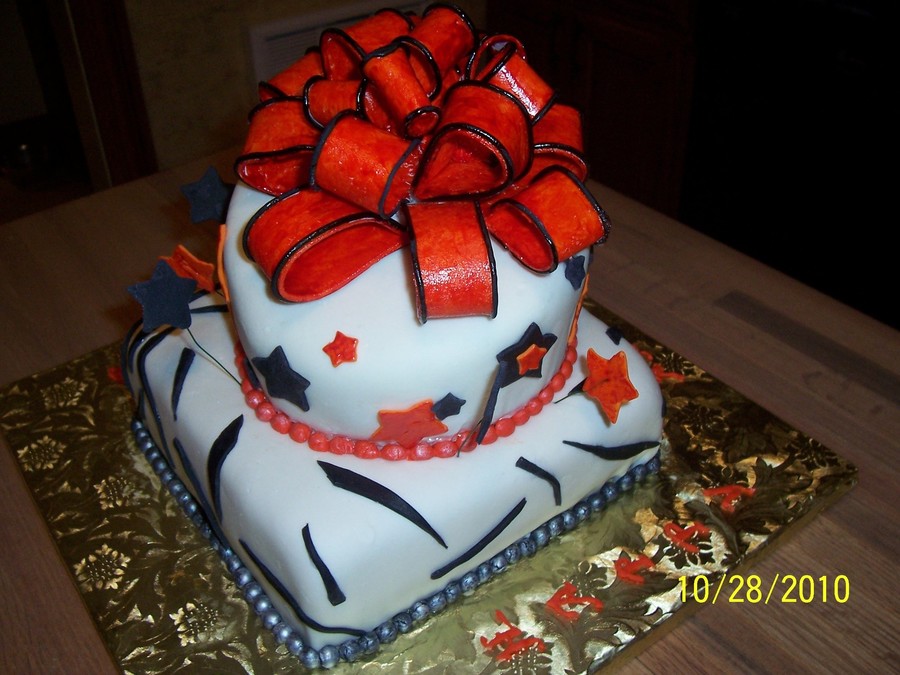 cake is covered with chocolate fondant and the bow is made of gum paste