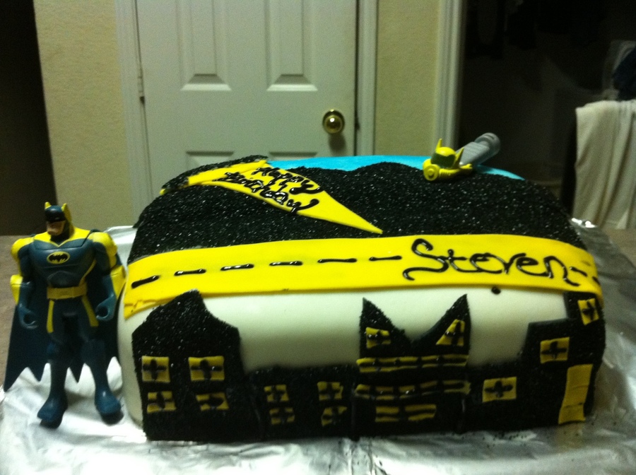 batman cake. easy to make. made out of fondant and black sugar crystals