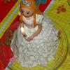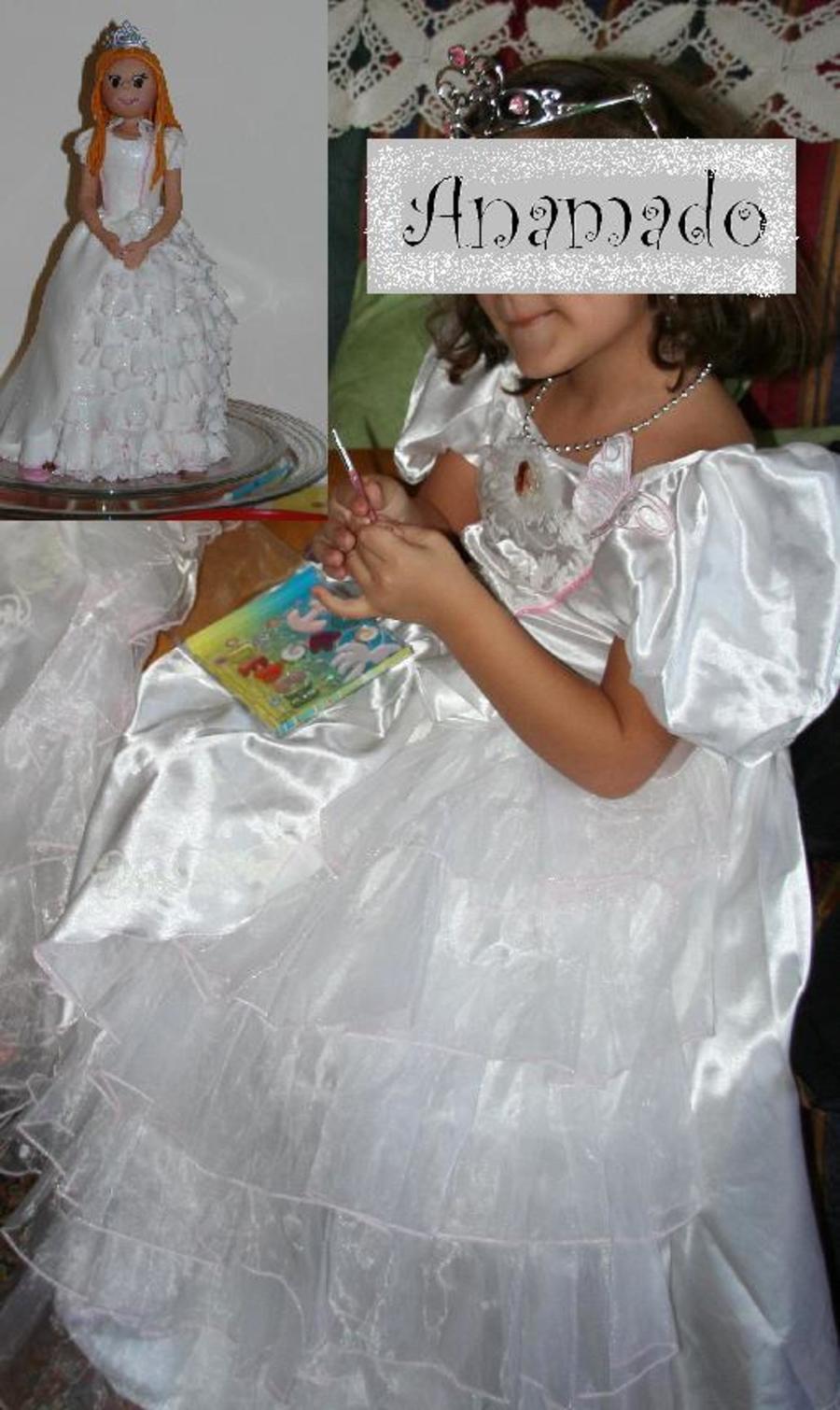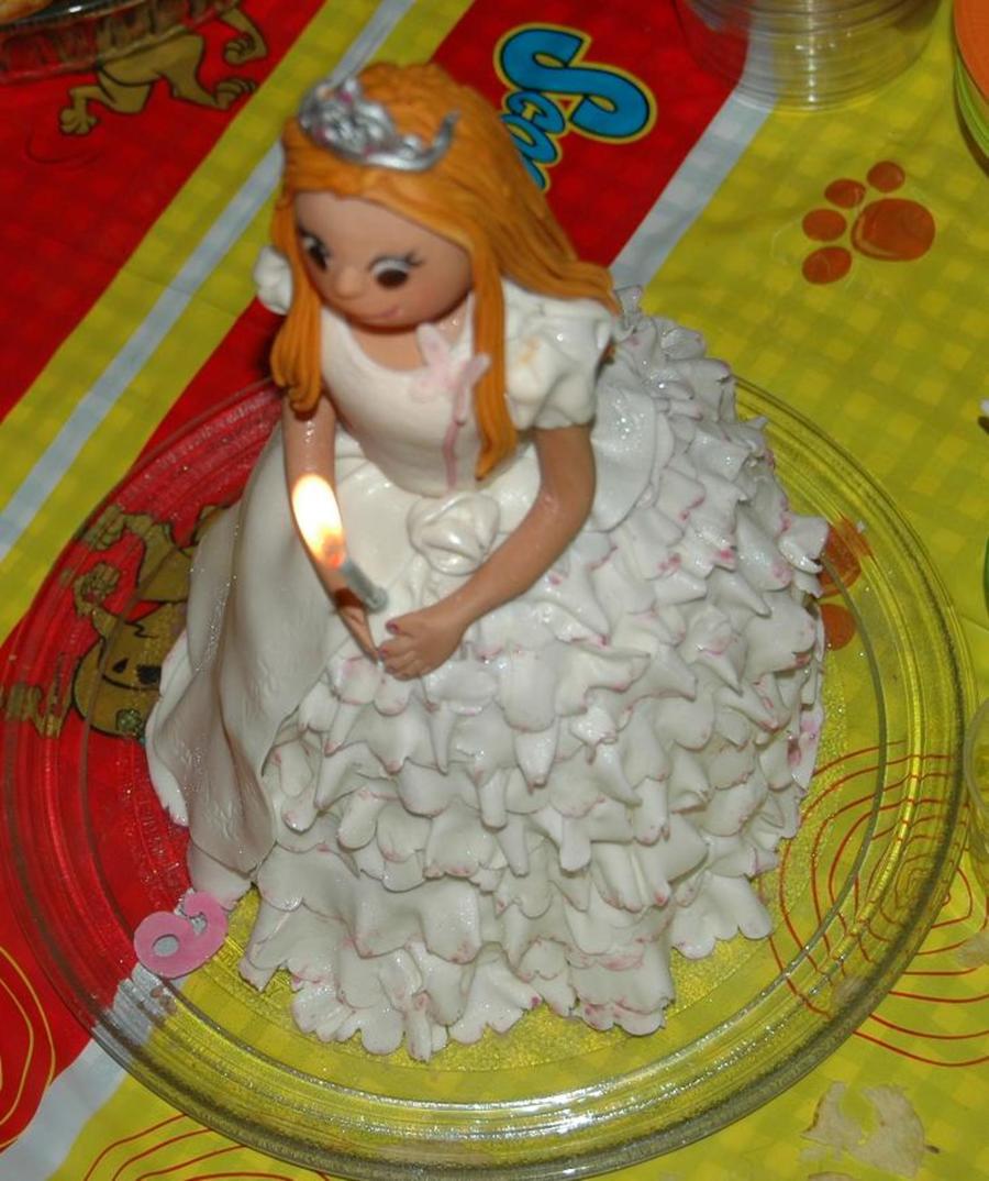 For my youngest girl and for her 6th birthday, I bought this beautiful Giselle enchanted dress from Disney. And to match it, I made a doll princess cake with the exact replica of the dress. I looooved doing it! It's chocolate sponge cake (skirt) covered with ganache and MMf for the dress. The body has Styrofoam inside, and the head and hair are all MMF too. In one of the pictures you can see her dress :-)