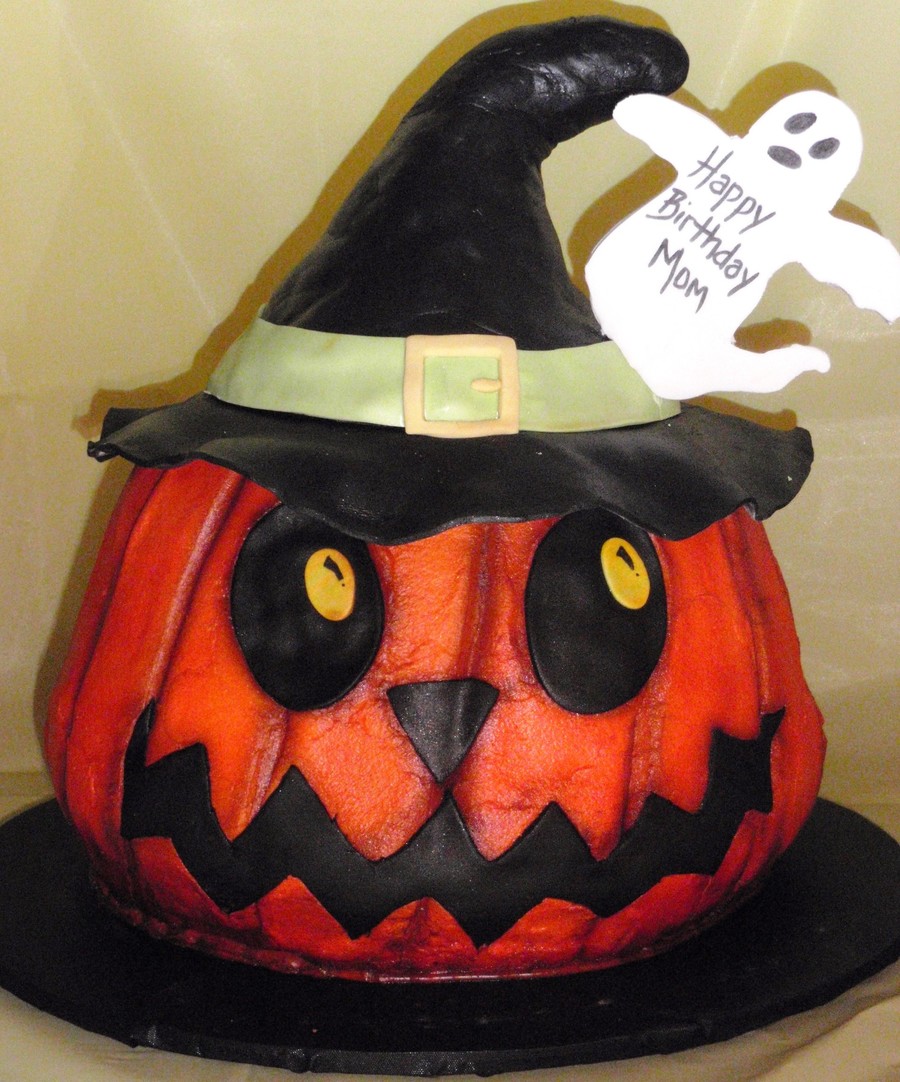 2 9" rounds with 1 8" round, iced in buttercream and airbrushed. Witch's hat is RKT covered in fondant. Gumpaste ghost.