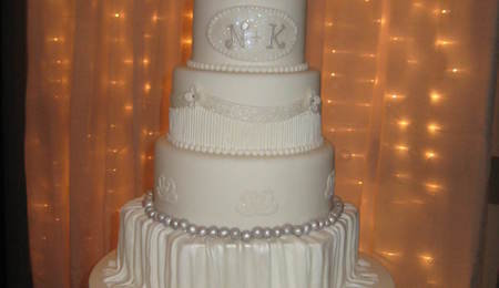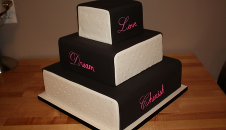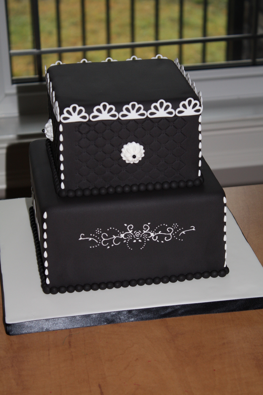 Cake covered in black fondant with white details. Bottom tier has a piped design.