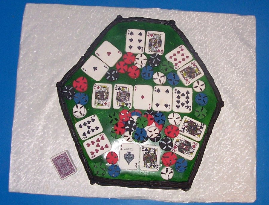 This cake I made for my husband's friend and coworker for his birthday. The cards are printed on edible icing sheets and put on fondant the poker chips are colored fondant. The cake is a choc. cake with choc buttercream icing amd the fondant is drk choc. I get alot of requests for choc cakes. LOL.