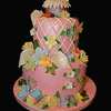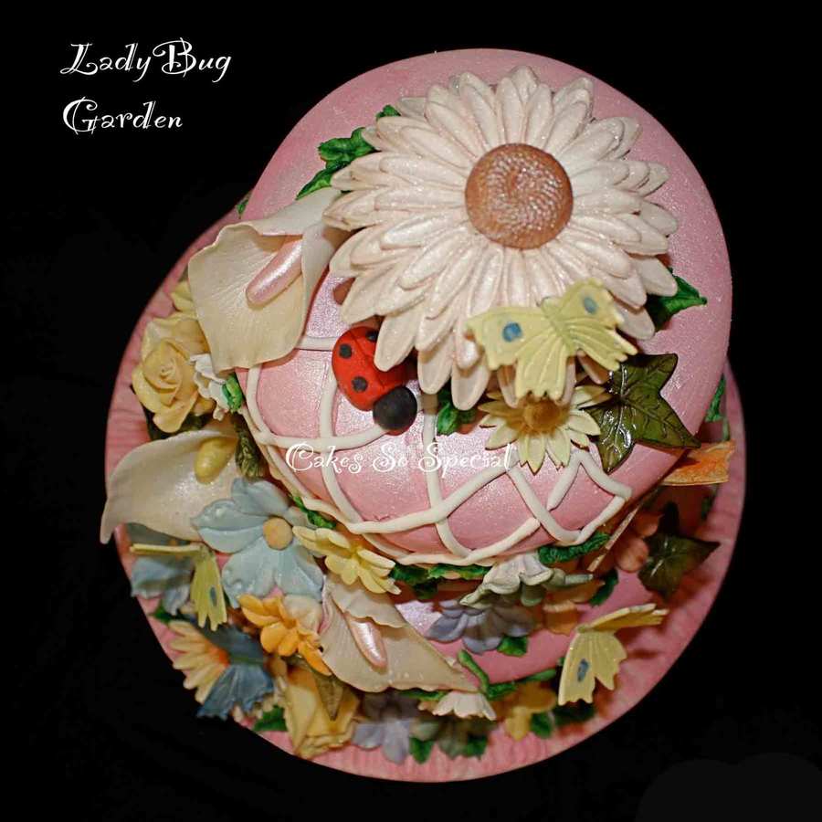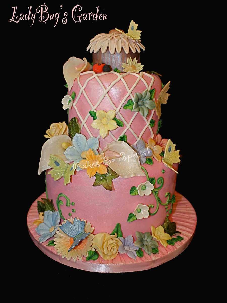 Molded flowers, cutter flowers, lady bug, extruded trellis, dipped rose and ivy leaves, piped vines and leaves. Lady Bug house was painted as was the cake. It started out white and I changed the color to pink. TFL